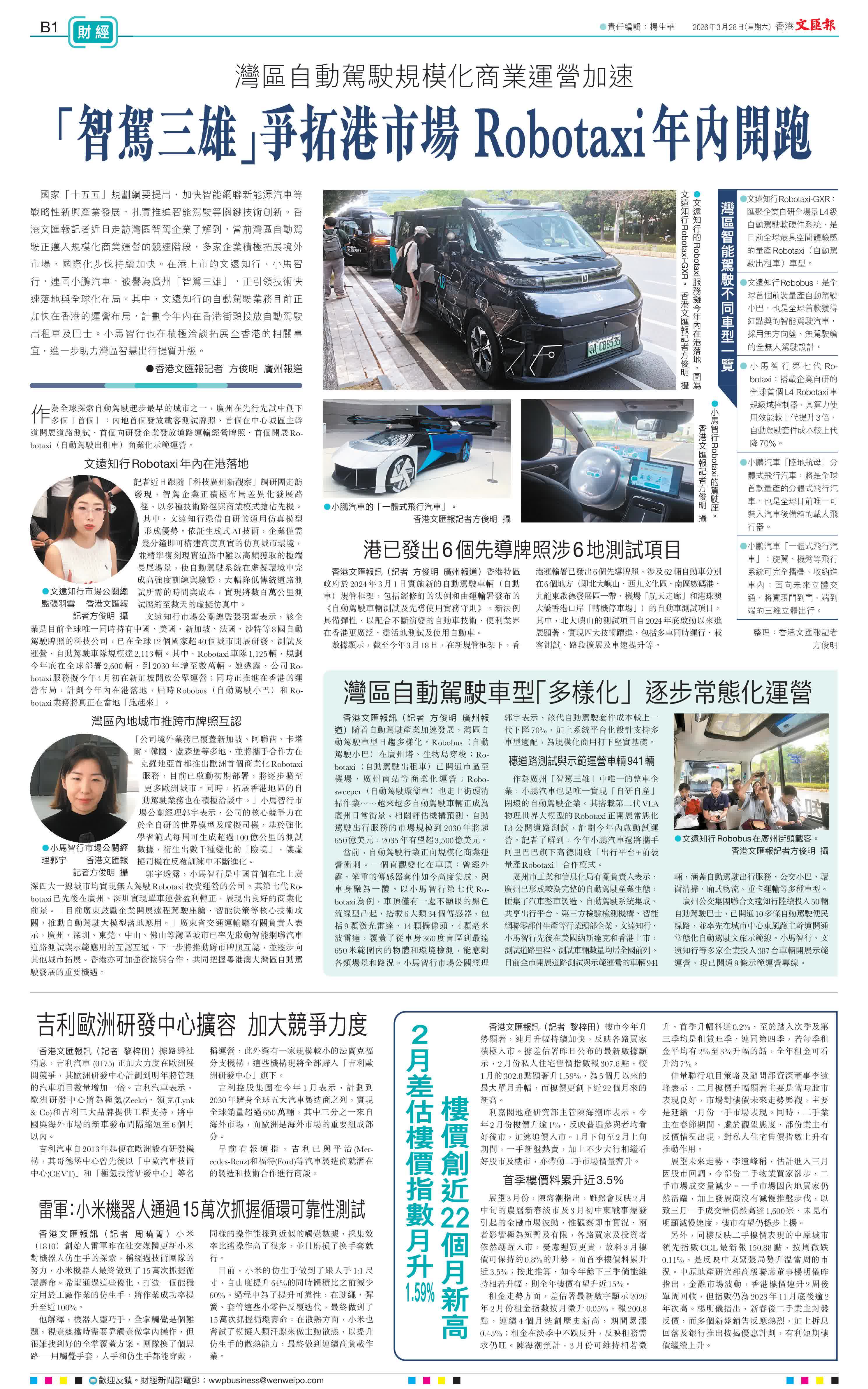 香港文匯報訊(記者 方俊明)國家「十五五」規劃綱要提出,加快智能網聯新能源汽車等戰略性新興產業發展,扎實推進智能駕駛等關鍵技術創新。香港文匯報記者近日走訪灣區智駕企業了解到,當前灣區自動駕駛正邁入規模化商業運營的競速階段,多家企業積極拓展境外市場,國際化步伐持續加快。在港上市的文遠知行、小馬智行,連同小鵬汽車,被譽為廣州「智駕三雄」,正引領技術快速落地與全球化布局。其中,文遠知行的自動駕駛業務目前正加快在香港的運營布局,計劃今年內在香港街頭投放自動駕駛出租車及巴士。小馬智行也在積極洽談拓展至香港的相關事宜,進一步助力灣區智慧出行提質升級。