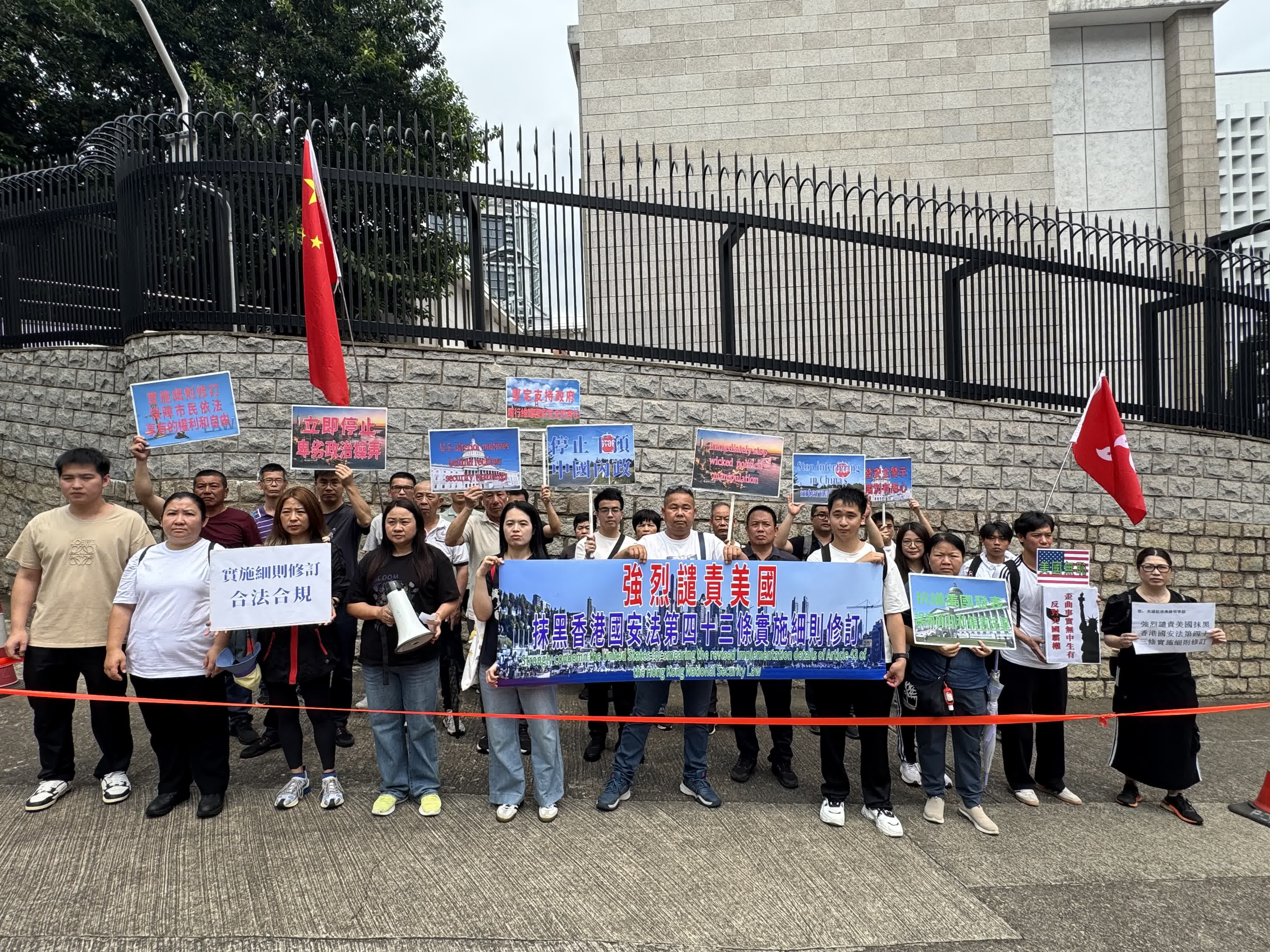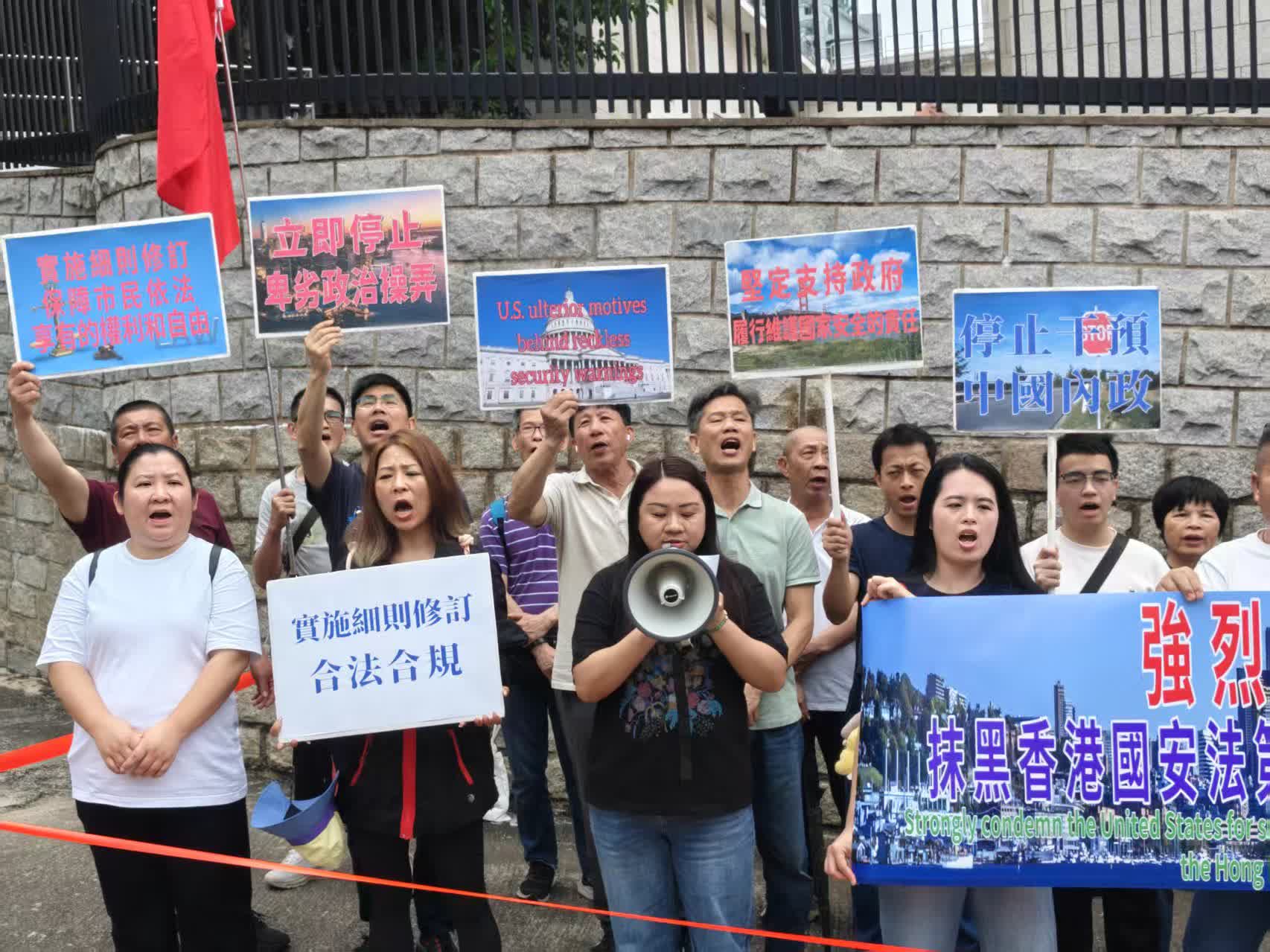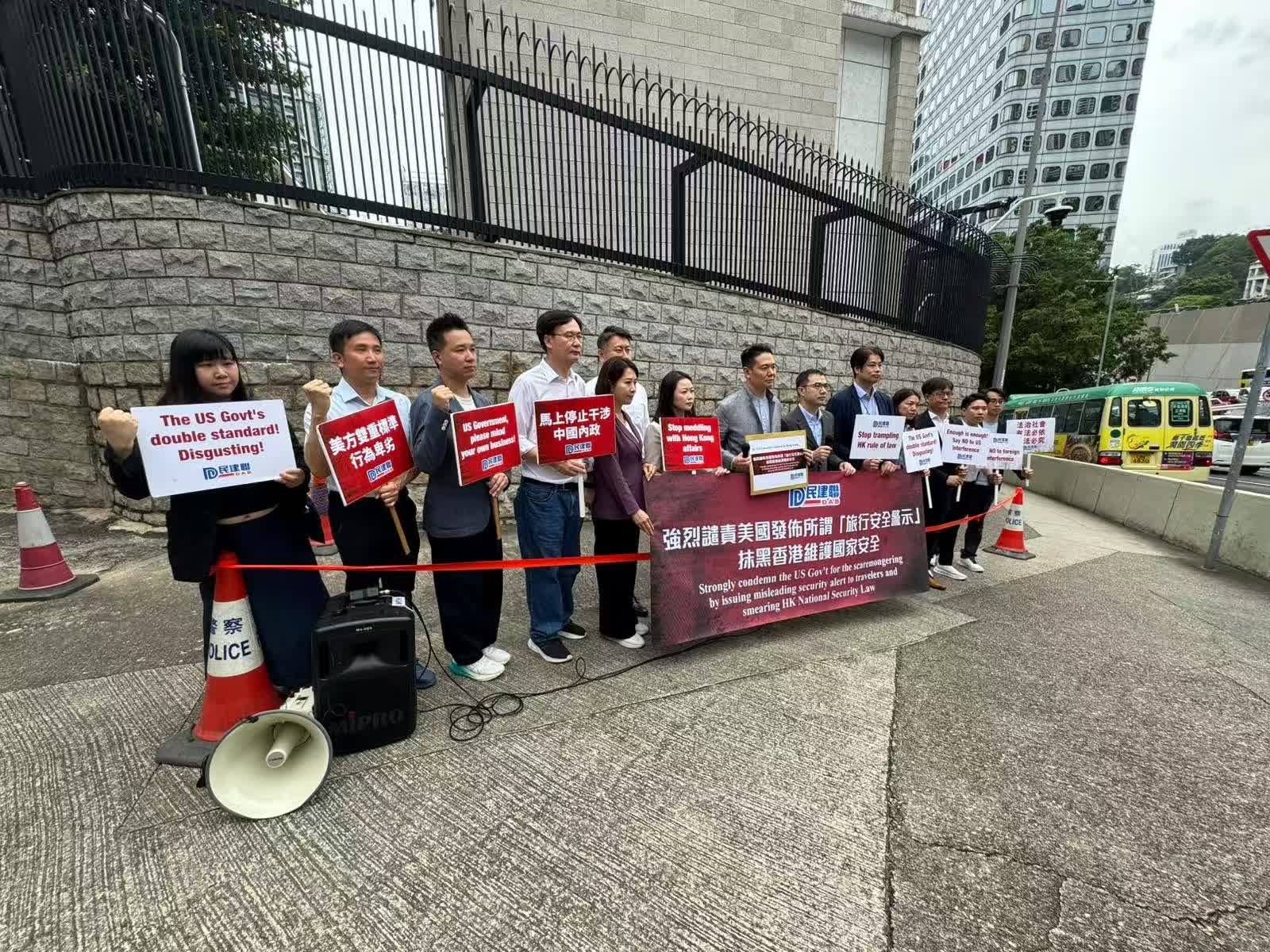 民建聯約20人於美國駐港領事館外進行抗議。現場集會人士各自手舉「馬上停止干涉中國內政」、「美方雙重標準行為卑劣」等告示,拉出帶有民建聯標識的「強烈譴責美國發布所謂『旅行安全警示』抹黑香港維護國家安全」的長橫幅,並放置抗議書於領館大門外的路障上。