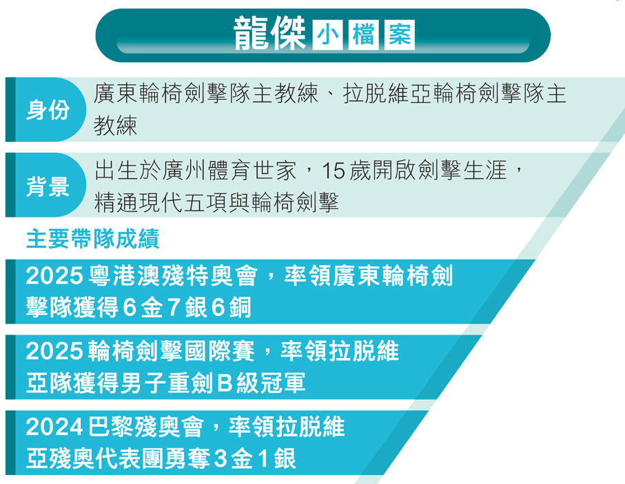 目前,龍傑正全力搭建省—市兩級聯動的輪椅劍擊人才培養體系,推動建設輪椅劍擊專業場館,讓更多殘疾人參與這項運動。他表示殘特奧會結束後,正推動茂名、清遠、東莞等地率先組建市級隊伍,逐步覆蓋全省,形成穩定人才梯隊。未來,他期待廣東全省保有70至80名輪椅劍擊註冊運動員,並建立標準化選拔、訓練與競賽機制,把輪椅劍擊打造成廣東殘疾人體育名片。龍傑堅信,有了多方支持、完善的設施與大灣區優勢,廣東輪椅劍擊能從「一年奇跡」走向「長期強盛」。