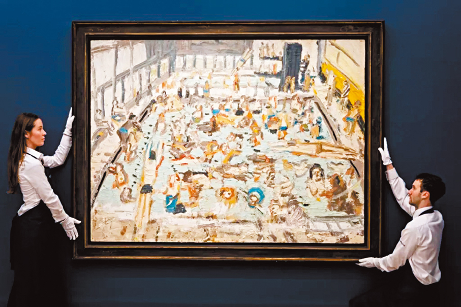 倫敦畫派另一位巨匠里昂·科索夫的經典泳池系列作品《八月,星期六上午11點的兒童游泳池》自1992年現身拍場後,已睽違34年。根據線上拍賣直播觀察,該作此次現身市場,吸引多達10位買家激烈出價,最終以高預估價七倍之多的521.4萬英鎊(約700萬美元)強勁成交。據介紹這個價格不僅是1992年成交價的25倍,更一舉將藝術家此前140萬英鎊的拍賣紀錄推升了近四倍,成為本場最具爆發力的亮點。
