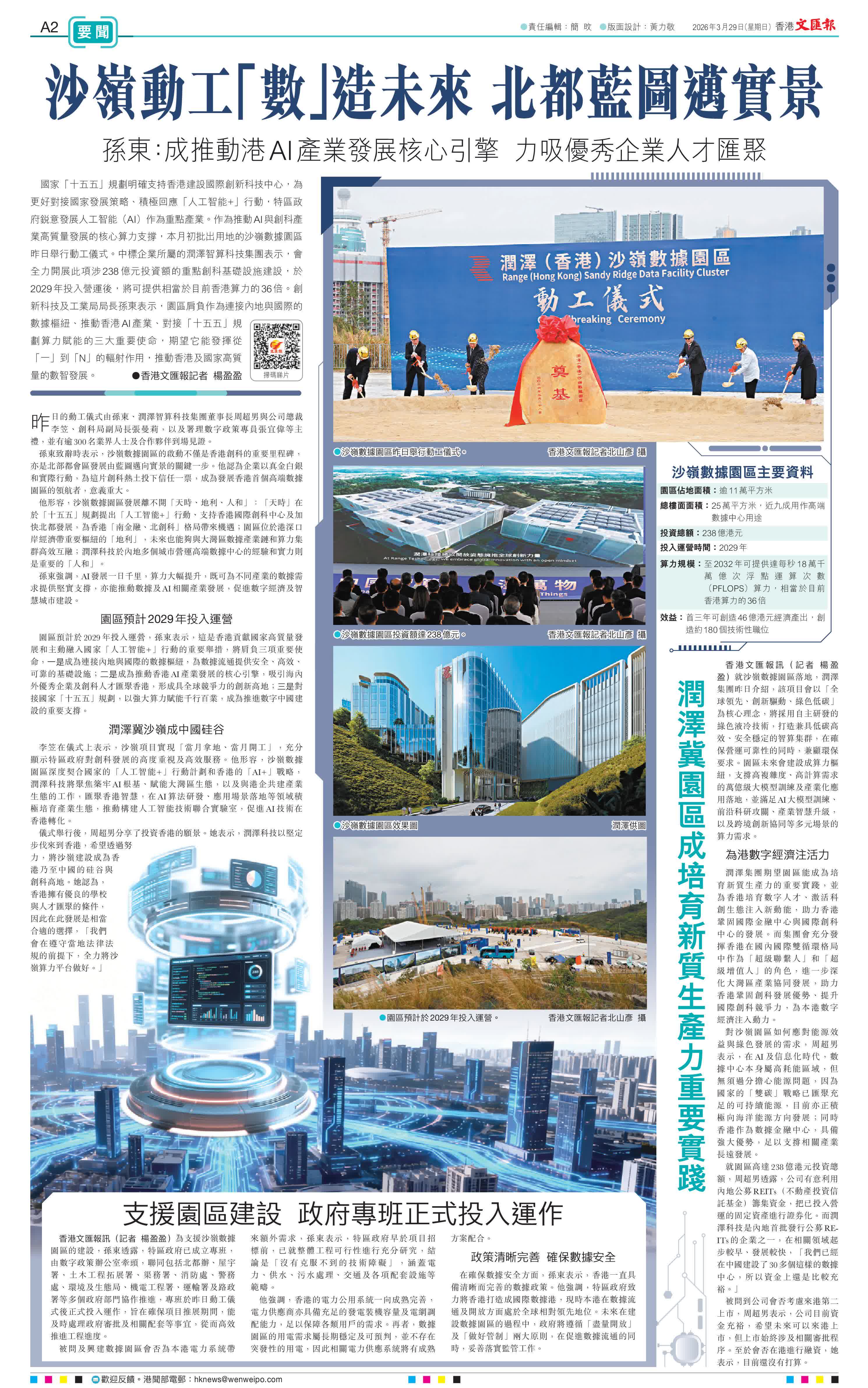 (香港文匯報記者 楊盈盈)國家「十五五」規劃明確支持香港建設國際創新科技中心,為更好對接國家發展策略,積極回應「人工智能+」行動,特區政府銳意發展人工智能(AI)作為重點產業。作為推動AI與創科產業高質量發展的核心算力支撐,本月初批出用地的沙嶺數據園區昨日舉行動工儀式。中標企業所屬的潤澤智算科技集團表示,會全力開展此項涉238億元投資額的重點創科基礎設施建設,於2029年投入營運後,將可提供相當於目前香港算力的36倍。創新科技及工業局局長孫東表示,園區肩負作為連接內地與國際的數據樞紐、推動香港AI產業、對接「十五五」規劃算力賦能的三大重要使命,期望它能發揮從「一」到「N」的輻射作用,推動香港及國家高質量的數智發展。