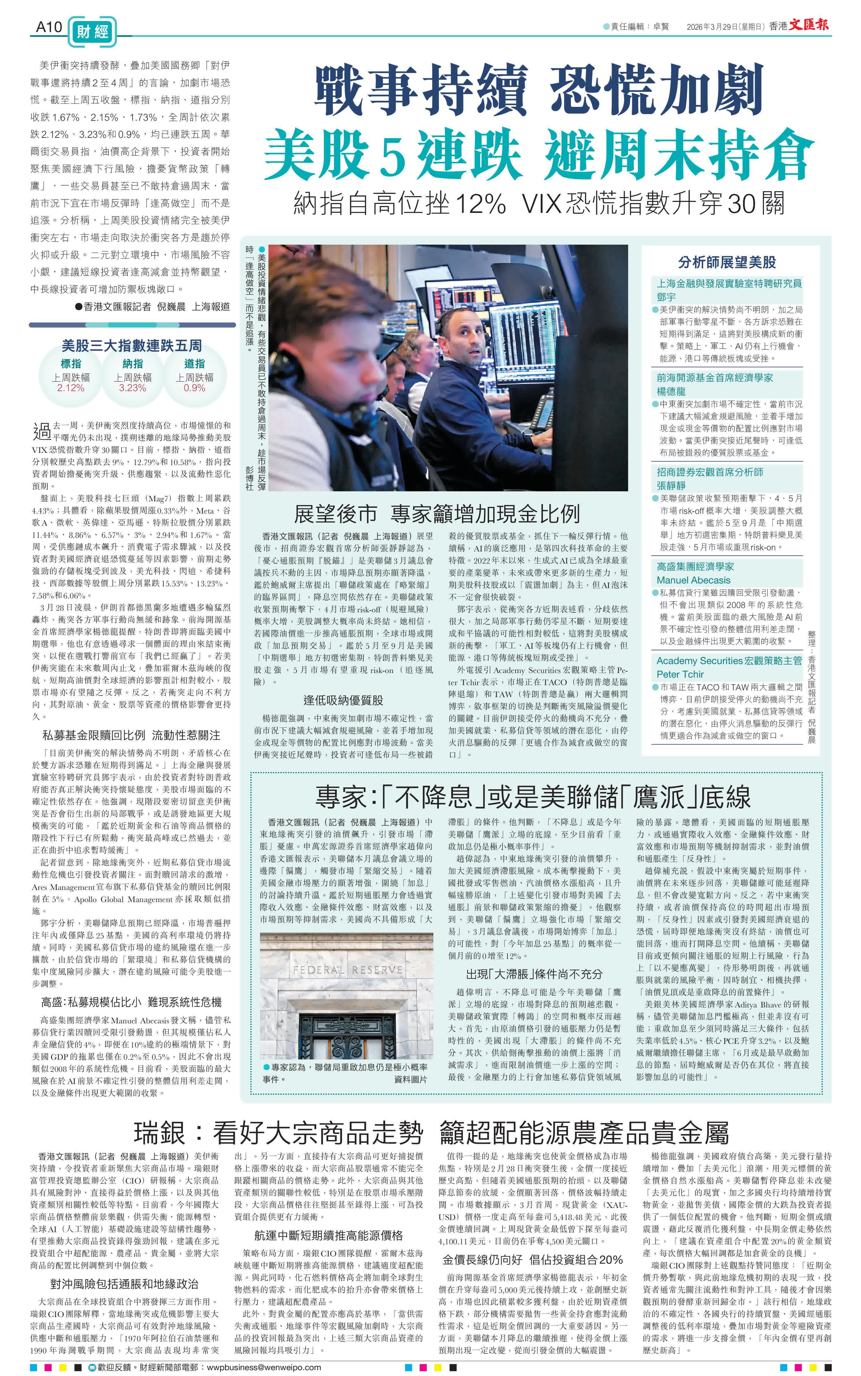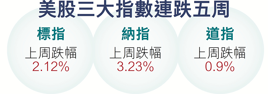 (香港文匯報記者 倪巍晨 上海報道)美伊衝突持續發酵,疊加美國國務卿「對伊戰事還將持續2至4周」的言論,加劇市場恐慌。截至上周五收盤,標指、納指、道指分別收跌1.67%、2.15%、1.73%,全周計依次累跌2.12%、3.23%和0.9%,均已連跌五周。華爾街交易員指,油價高企背景下,投資者開始聚焦美國經濟下行風險,擔憂貨幣政策「轉鷹」,一些交易員甚至已不敢持倉過周末,當前市況下宜在市場反彈時「逢高做空」而不是追漲。分析稱,上周美股投資情緒完全被美伊衝突左右,市場走向取決於衝突各方是趨於停火抑或升級。二元對立環境中,市場風險不容小覷,建議短線投資者逢高減倉並持幣觀望,中長線投資者可增加防禦板塊敞口。