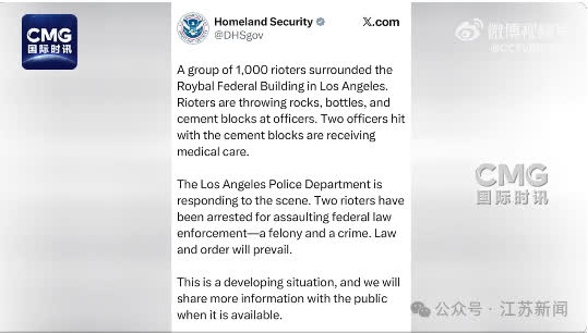 據CCTV國際時訊消息,當地時間3月28日,美國國土安全部在社交媒體發文表示,在當天抗議遊行結束後,1000名抗議者「包圍」了洛杉磯的羅伊巴爾聯邦大樓,並與警方發生衝突。抗議者向建築投擲石塊、水瓶、水泥塊等,兩名聯邦工作人員被擊中,目前正在接受治療,另有兩名抗議者因襲擊聯邦執法部門被捕。