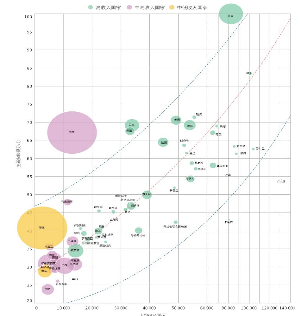 從具體得分看,中國國家創新指數得分為67.2分,超過法國、荷蘭,與日本、英國、德國等排名5~9位國家間的差距縮小,主要指標增速高於發達國家水平。總體來看,中國創新能力接近人均GDP在5萬美元左右的發達國家,且仍處於穩步上升的通道。