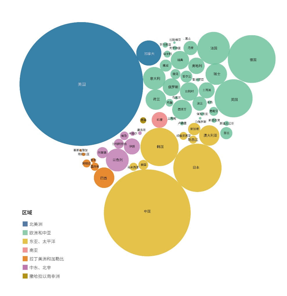 歐洲地區整體表現強勁。瑞士、德國、法國等26個國家人口合計佔全球的9.3%,GDP佔全球的23.8%,其R&D經費投入總量佔全球的21.6%。