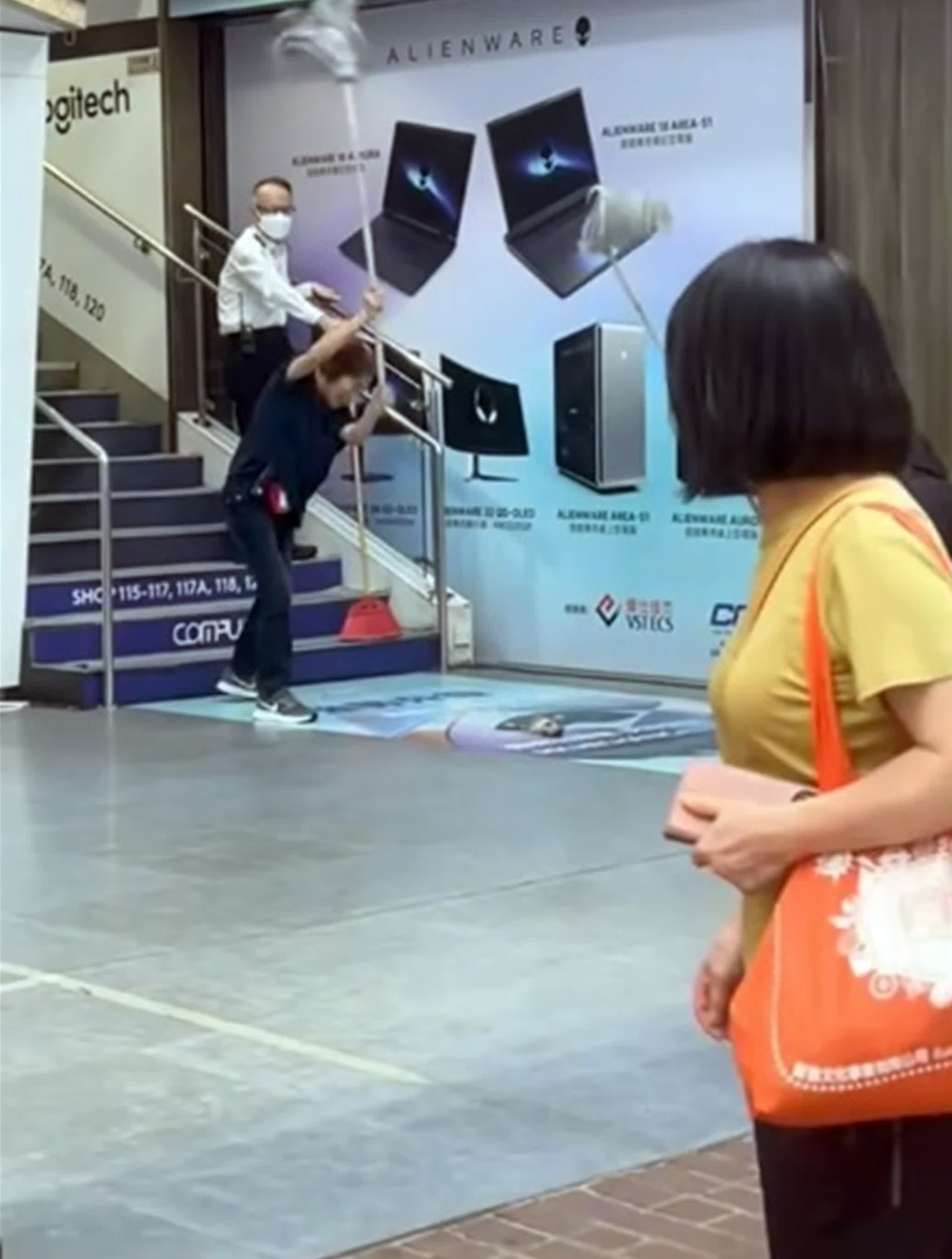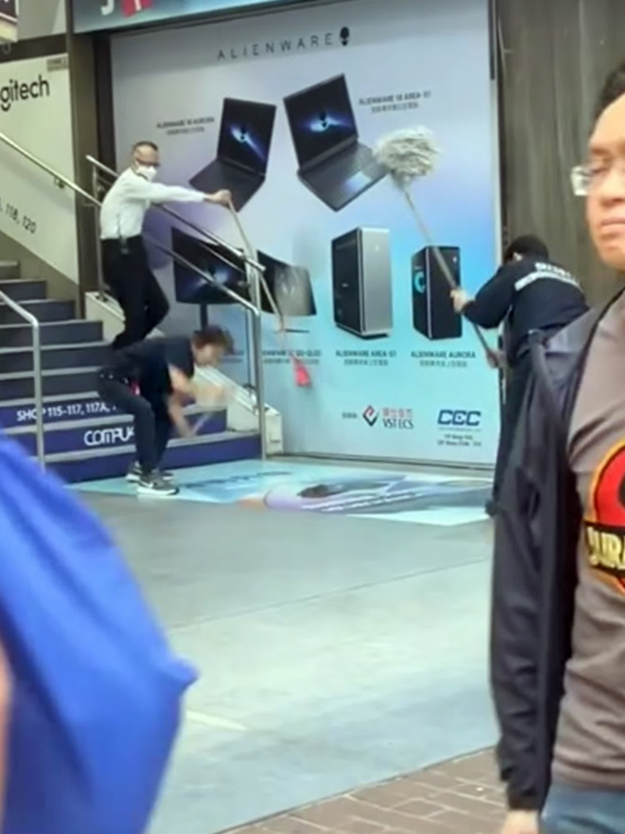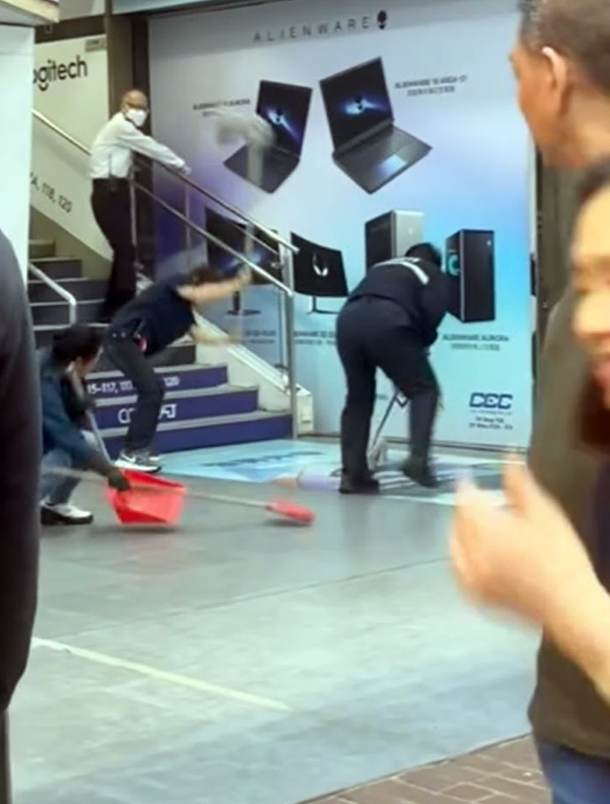 香港文匯報訊(記者 蕭景源)網上今晚(29日)瘋傳一條商場保安員連同清潔工,分以地拖把瘋狂擊打地上一隻老鼠的片段,由於他們揮舞拖把的動作相當之誇張和肉緊,引起網民熱烈討論。但片段未交待事發時間和地點,有網民則指現場是旺角電腦中心。