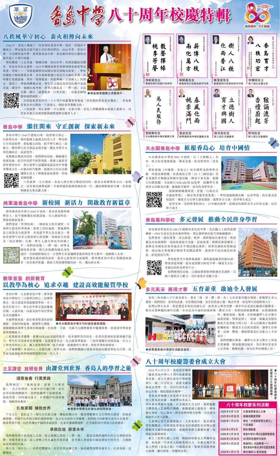 八秩風華,守正創新。香島人將在堅守傳統的同時,探索未來辦學新方向、新模式,培育兼具國際視野、卓越學識與愛國情操的新一代,讓校園煥發新生機,為香港與國家未來貢獻力量。