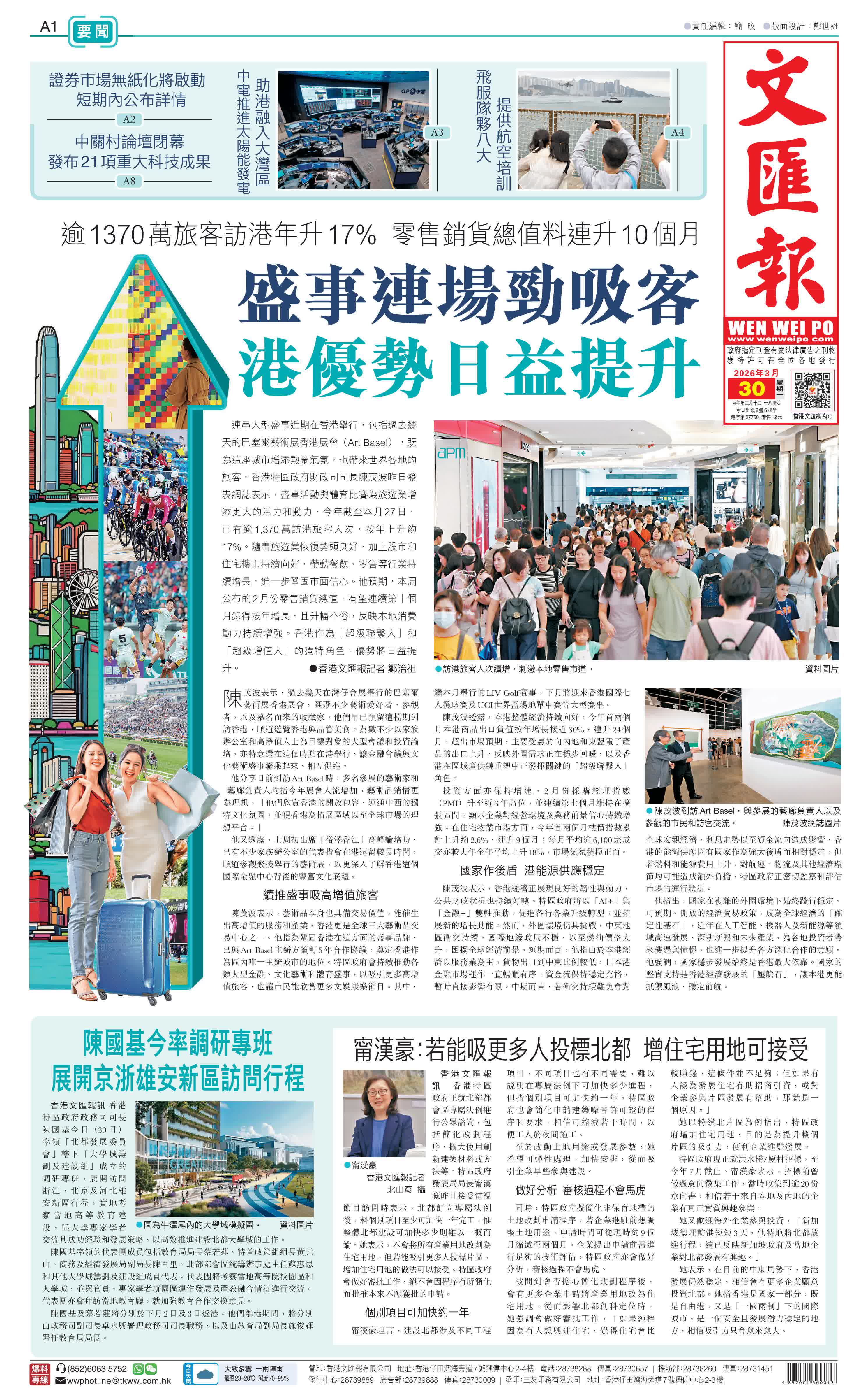 (香港文匯報記者 鄭治祖)連串大型盛事近期在香港舉行,包括過去幾天的巴塞爾藝術展香港展會(Art Basel),既為這座城市增添熱鬧氣氛,也帶來世界各地的旅客。香港特區政府財政司司長陳茂波昨日發表網誌表示,盛事活動與體育比賽為旅遊業增添更大的活力和動力,今年截至本月27日,已有逾1,370萬訪港旅客人次,按年上升約17%。隨着旅遊業恢復勢頭良好,加上股市和住宅樓市持續向好,帶動餐飲、零售等行業持續增長,進一步鞏固市面信心。他預期,本周公布的2月份零售銷貨總值,有望連續第十個月錄得按年增長,且升幅不俗,反映本地消費動力持續增強。香港作為「超級聯繫人」和「超級增值人」的獨特角色、優勢將日益提升。