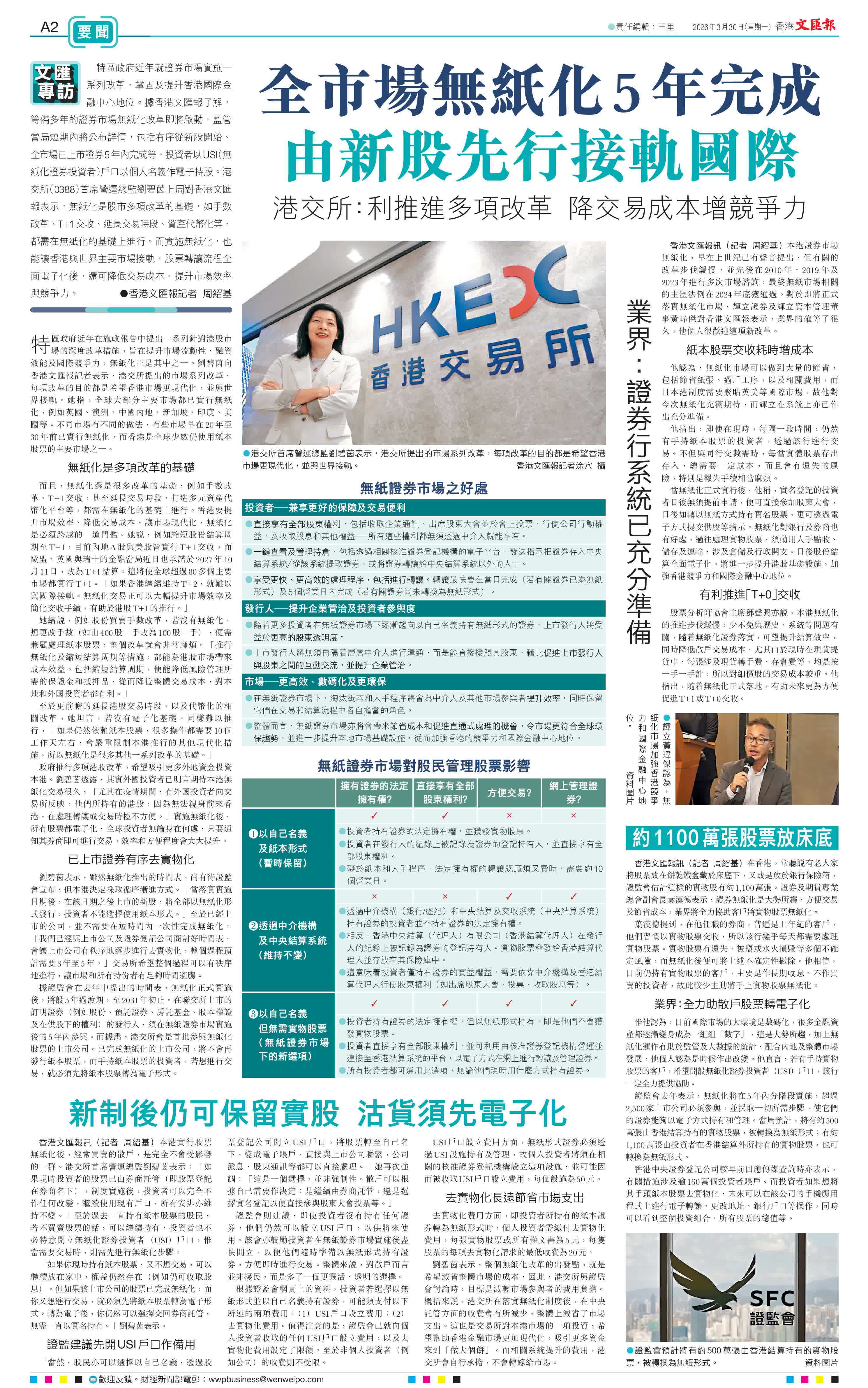 證監會去年表示,無紙化將在5年內分階段實施,超過2,500家上市公司必須參與,並採取一切所需步驟,使它們的證券能夠以電子方式持有和管理。當局預計,將有約500萬張由香港結算持有的實物股票,被轉換為無紙形式;有約1,100萬張由投資者在香港結算外所持有的實物股票,也可轉換為無紙形式。
