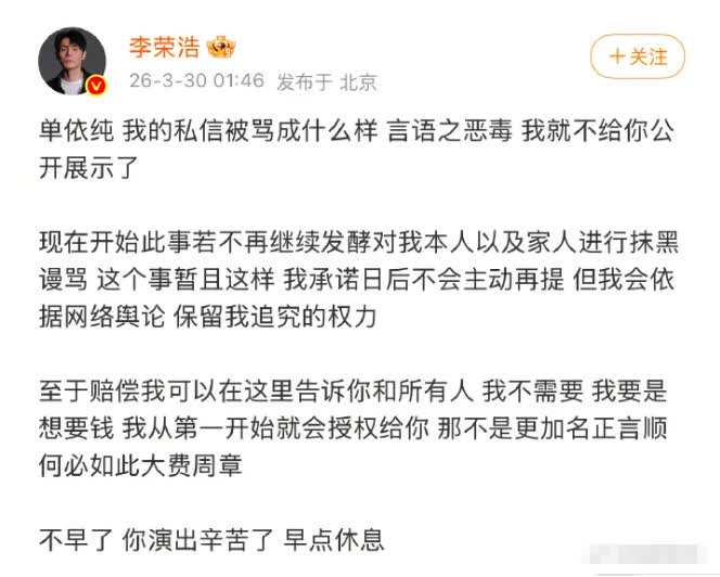 他表示,自己的私信已被大量惡毒謾罵攻陷,若事件不再繼續發酵、不再對他及家人進行抹黑謾罵,將暫時擱置此事,但會依據網絡輿論保留追究的權利。