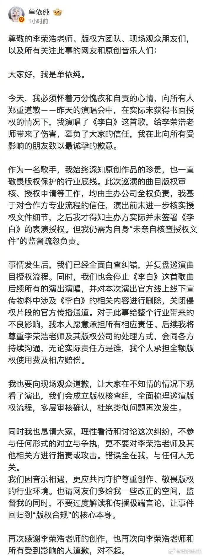 今日(3月30日)凌晨1時許,單依純發長文回應巡演演唱《李白》侵權一事。