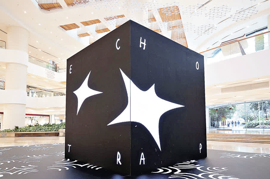 Kim為是次展覽演繹其作品「A String of Echo Traps」,以大型影像立方體結合全新委約創作的地板壁畫,運用Kim獨特的視覺語言,包括對聲音節奏與質感的探索,轉化為引人入勝的圖像。此次在太古廣場的展覽,回響圖案延伸至整個地板壁畫平台,邀請觀眾重新思考聲音在社會中的運作方式,以及口語溝通如何成為一種社交貨幣。