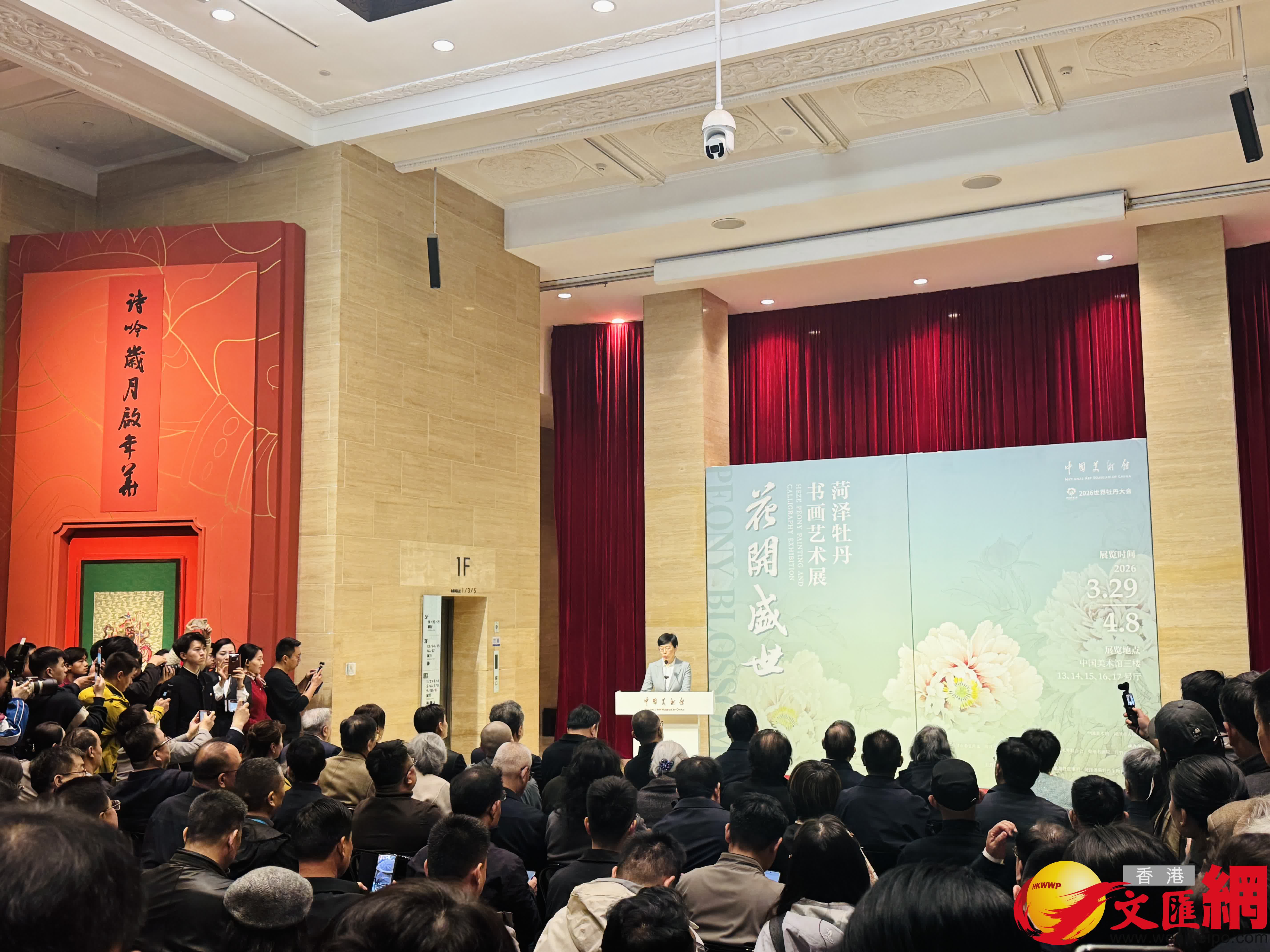 (香港文匯網記者李暢)3月29日,「花開盛世——菏澤牡丹書畫藝術展」在中國美術館開展。展覽匯集103件牡丹書畫精品,其中不乏吳昌碩、齊白石等近現代書畫大師的經典之作,系統呈現了牡丹藝術從傳統到現代的傳承與創新,也充分彰顯了菏澤作為「中國牡丹之都」的深厚文化底蘊。展覽將持續至4月8日。開展當日便吸引了眾多市民遊客駐足觀賞,現場人流絡繹不絕、氛圍熱烈。