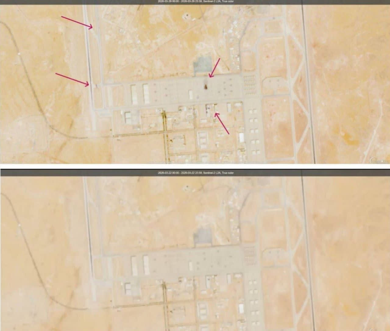 當地時間3月30日,伊朗方面發布衛星對比圖,顯示對沙特蘇丹王子空軍基地的美軍相關設施的打擊情況。伊朗稱,一架加油機和一架預警機以及部分建築物被擊毀。