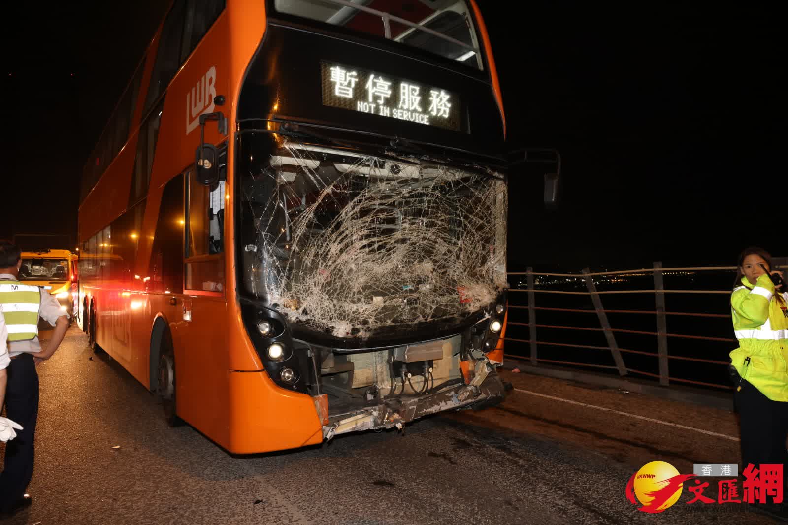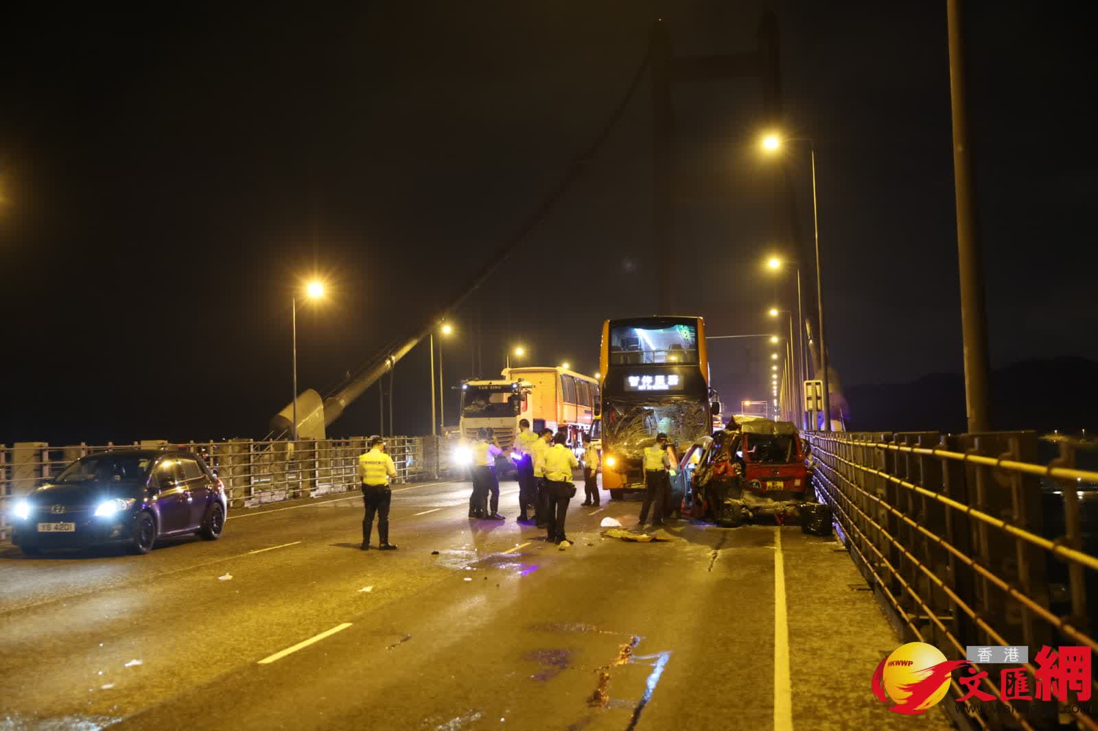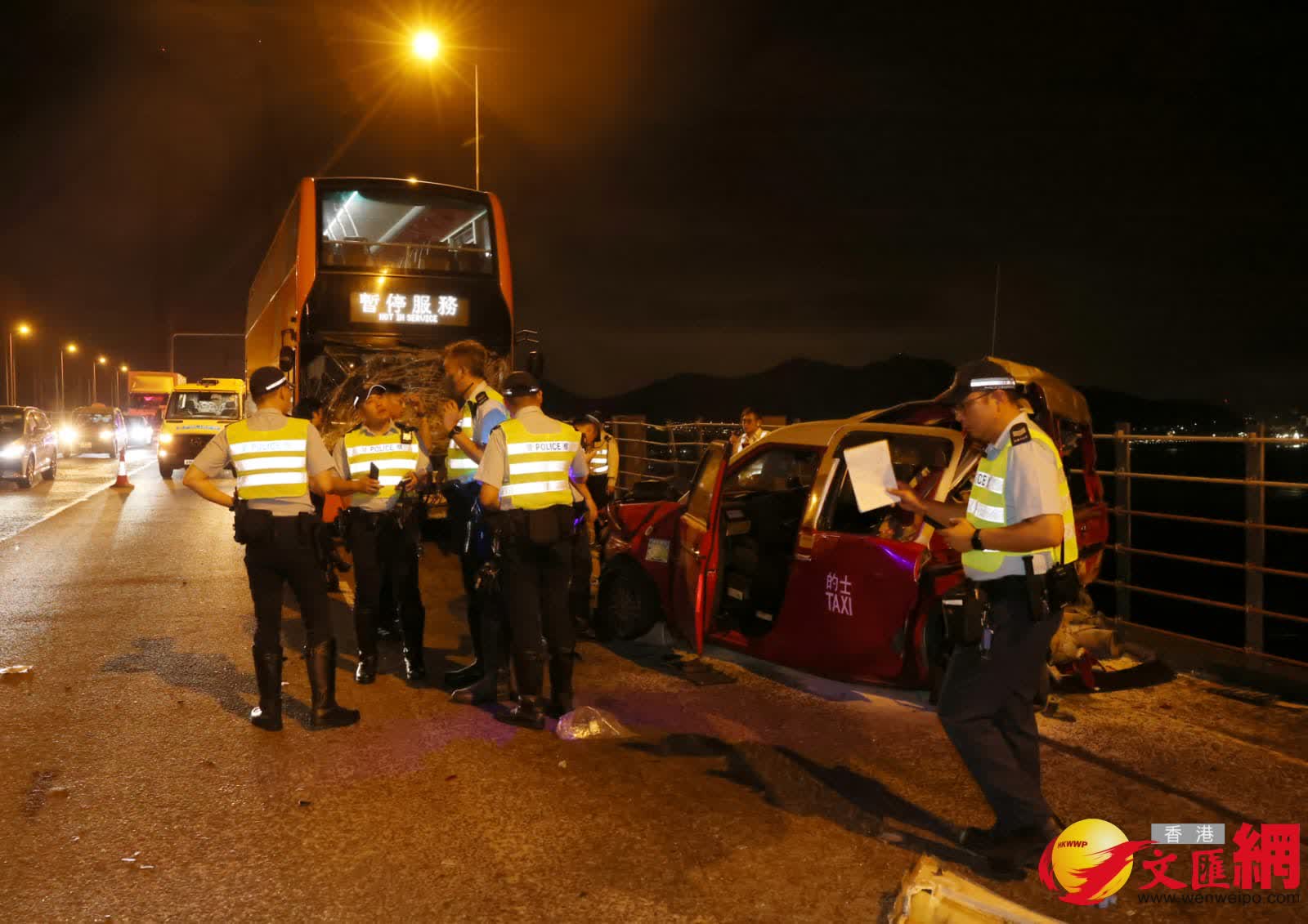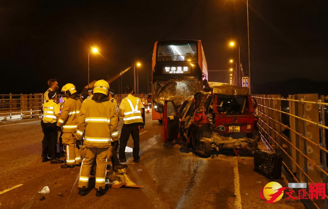 (有片) 青馬大橋深夜嚴重車禍 巴士的士相撞釀4傷 的士司機昏迷送院