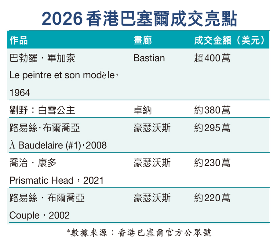 為期5天的2026年巴塞爾藝術展香港展會29日圓滿閉幕。本屆展會匯聚來自41個國家及地區的240間頂尖藝廊,貴賓預展與公眾開放期間共錄得約91,500名訪客到場,現場交易氣氛熾熱,各級市場均展現出強勁的銷售動能,進一步鞏固了香港作為全球藝術生態中亞洲核心交匯點的關鍵地位。巴塞爾展會表示:「本屆展會全球廣泛參與、銷售表現強勁、機構合作深化,鞏固亞洲藝術市場核心地位,跨區域需求反映亞太市場的深度正在不斷提升,廣泛國際藏家與美術館的參與、策展框架的持續演進,以及與城市文化生態的深層聯動,再次肯定展會為全球藝術生態中的重要樞紐地點。」