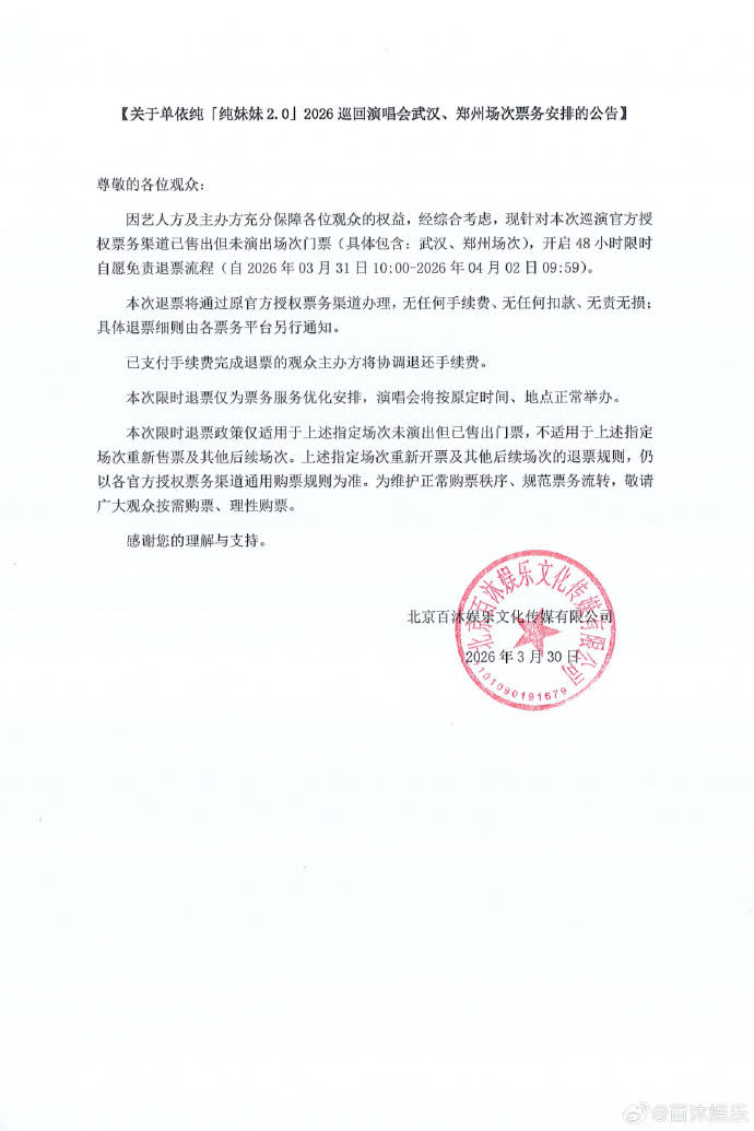 香港文匯網訊 3月30日,單依純本次巡演的主辦方北京百沐娛樂文化傳媒有限公司@百沐娛樂 發布公告:經綜合考慮,針對@單依純 「純妹妹2.0」2026巡迴演唱會官方授權票務渠道已售出但未演出場次門票(具體包含:武漢、鄭州場次),開啟48小時限時自願免責退票流程(自2026年03月31日10:00—2026年04月02日09:59)。