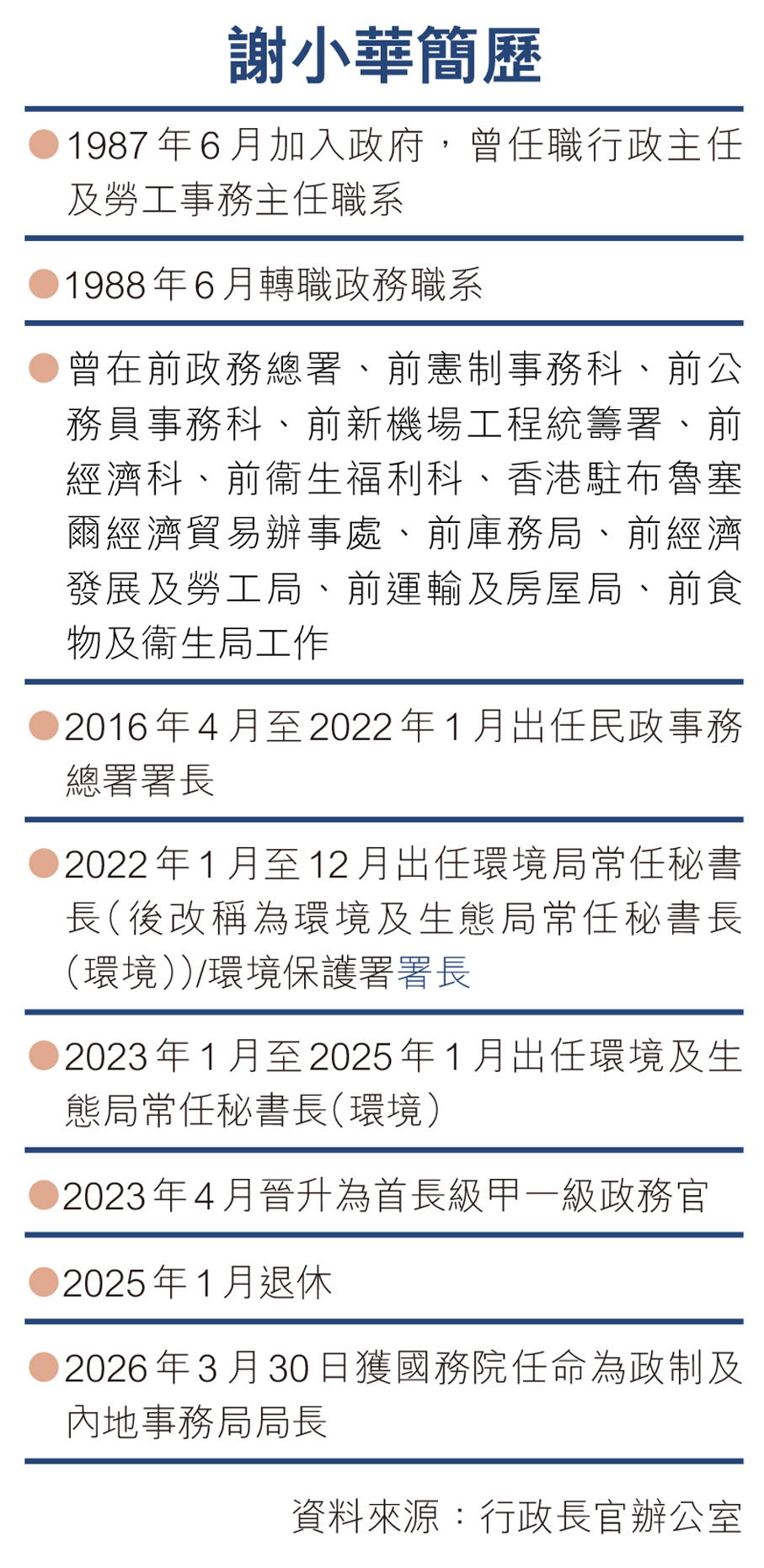 政制及內地事務局局長一職,因前任局長曾國衞請辭,自今年1月27日出缺。李家超昨日表示,謝小華是退休的資深政務主任,有38年在政府工作的經驗,表現卓越,有領導能力,具備豐富行政和管理經驗,能與政府上下建立良好的溝通和合作關係,因此決定邀請對方接任為政制及內地事務局局長,「她認同和支持我的施政理念。我認為她合適和有能力履行政制及內地事務局局長的職責。」