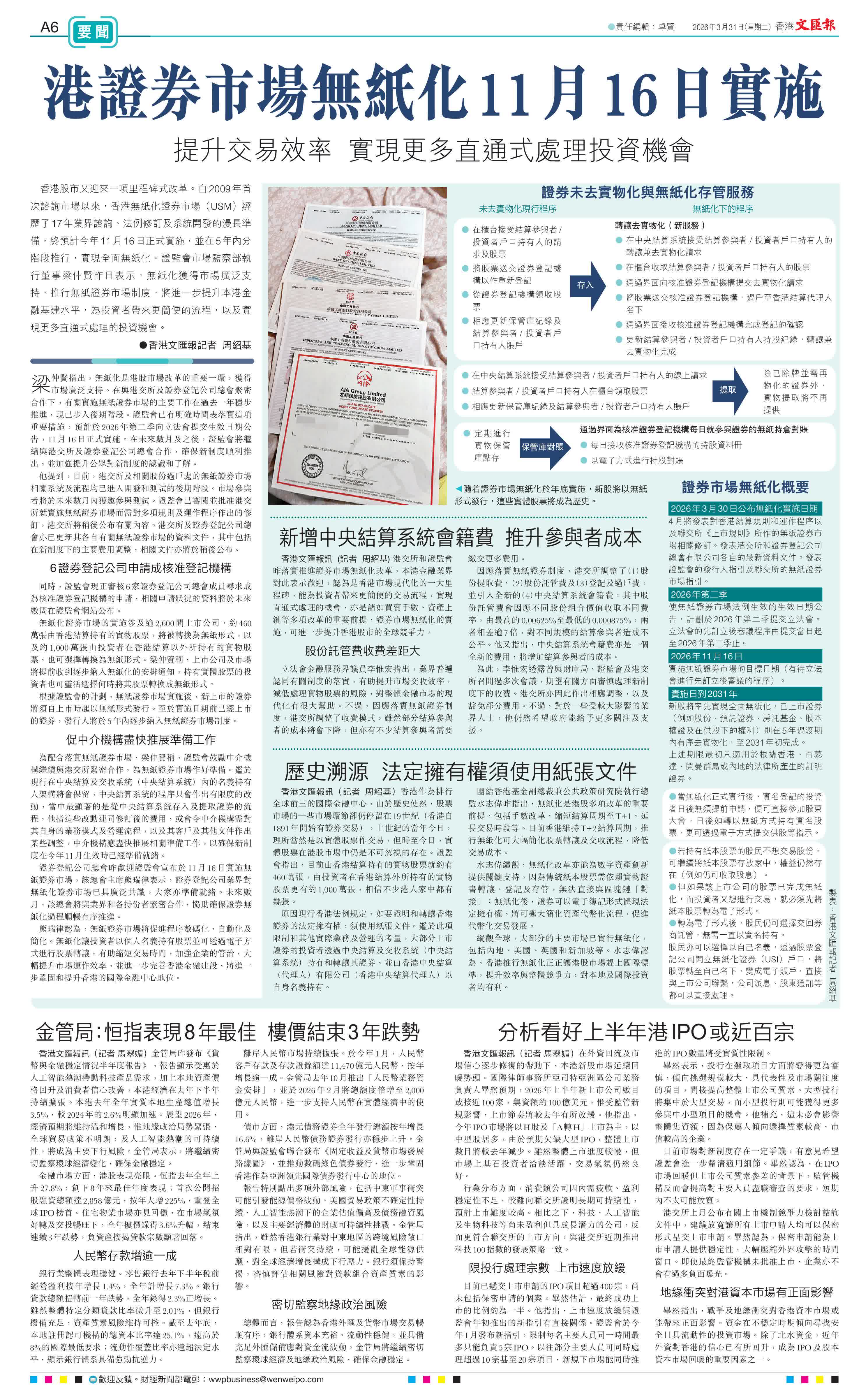 團結香港基金副總裁兼公共政策研究院執行總監水志偉昨指出,無紙化是港股多項改革的重要前提,包括手數改革、縮短結算周期至T+1、延長交易時段等。目前香港維持T+2結算周期,推行無紙化可大幅簡化股票轉讓及交收流程,降低交易成本。