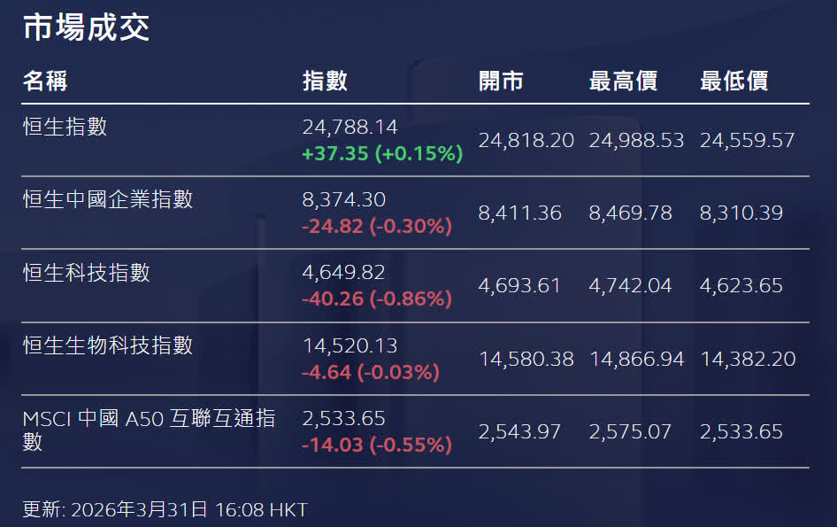 香港文匯報訊 地緣政治風險仍困擾亞太股市,而港股在業績向好等內部因素支持下表現相對平穩。恒生指數午市一度低見24,559點(跌約191點或0.77%),隨後跌幅收窄,收報24,788點,全日升37點或0.15%。國企指數則跌0.30%,恒生科技指數亦跌0.86%。大市成交額約2,557.60億元。