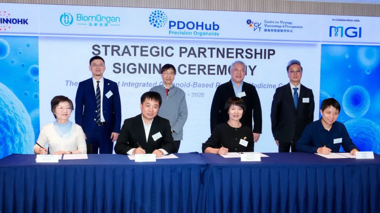 (香港文匯網記者 郭若溪)3月31日,香港生命科學公司比幹生物(簡稱「比幹生物」)、病毒與疫苗研究中心(簡稱「CVVT」)與華大智造在香港科學園宣布達成三方戰略合作,聯合打造亞洲首個整合式類器官精準醫學中心—PDOHub™ HK(以下簡稱「中心」),三方將發揮各自技術優勢,共同推動精準醫學、臨床決策支持及多病種轉化研究的發展。