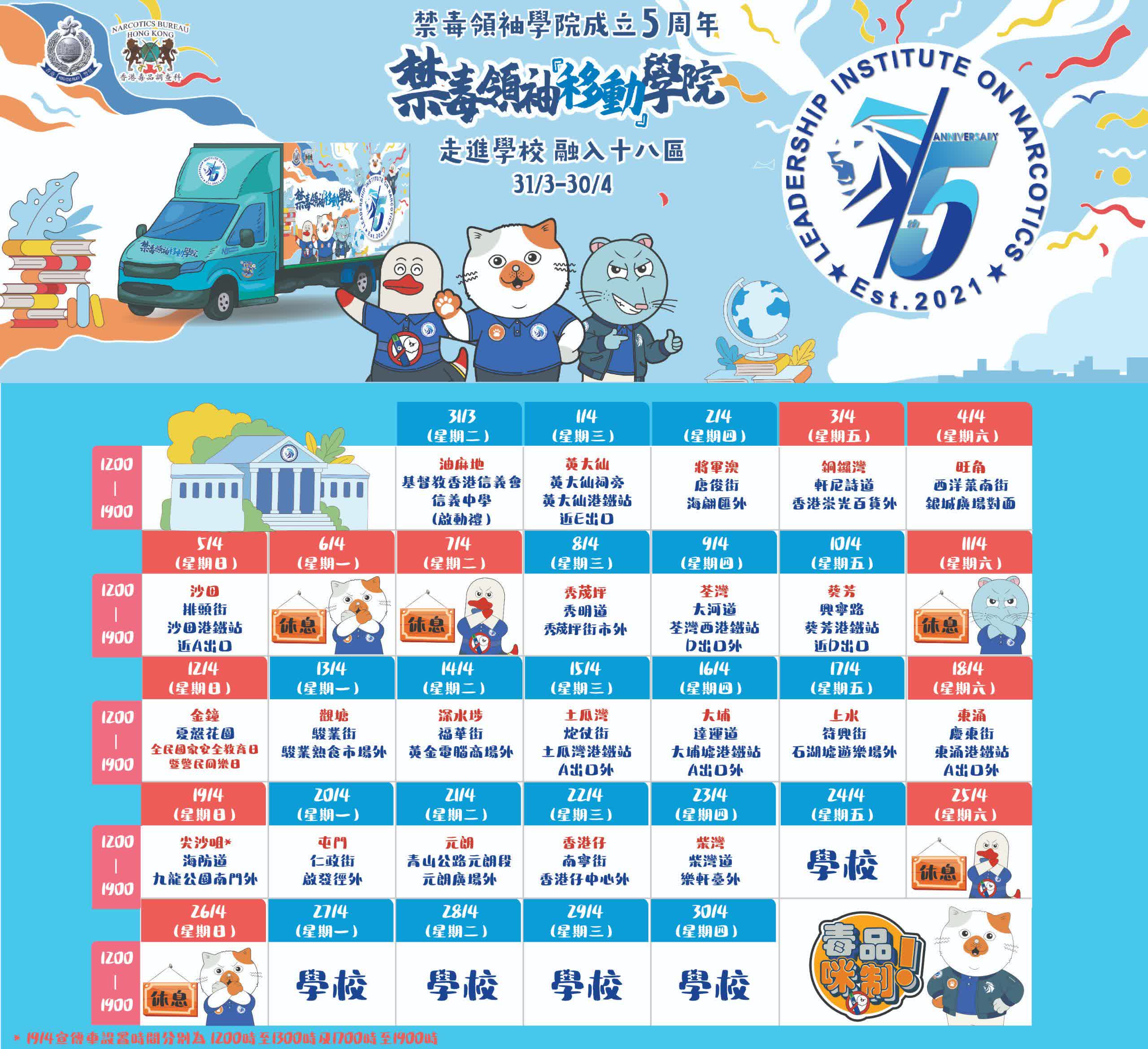 「禁毒領袖移動學院」將於3月31日至4月30日走訪全港各區提升公眾抗毒意識,詳情可參閱路線圖。