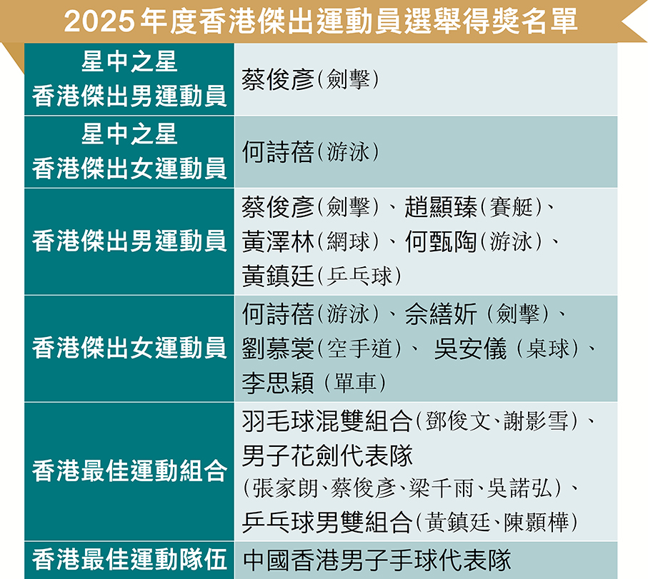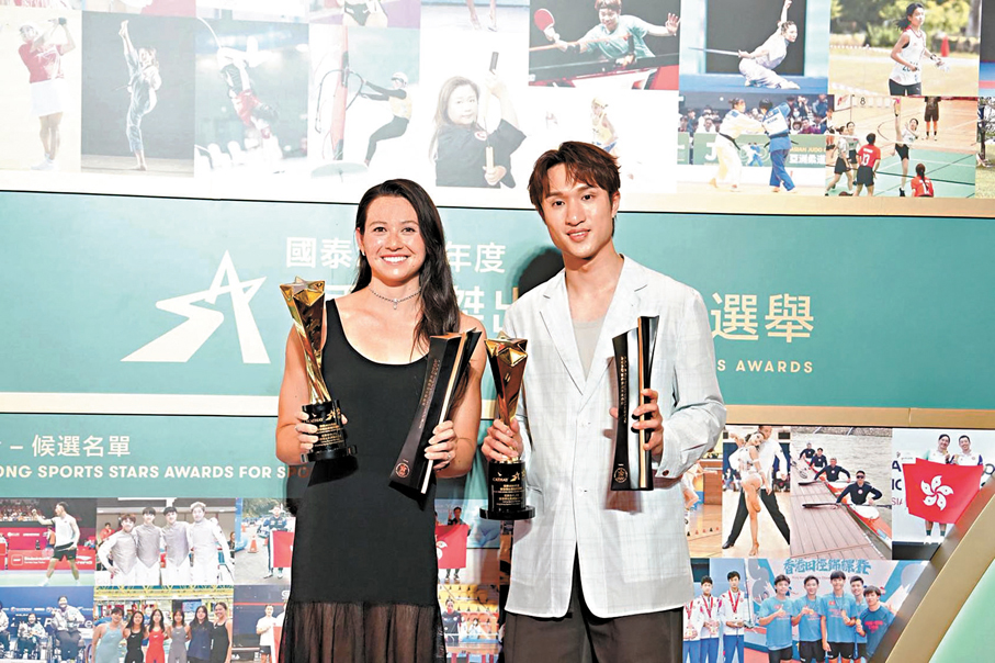 「國泰2025年度香港傑出運動員選舉」頒獎禮昨晚在香港會議展覽中心舉行,揭曉一年一度的「香港體壇奧斯卡」各大獎項得獎名單。在去年世界劍擊錦標賽奪金,登上「世一」的蔡俊彥(Ryan)首次榮膺男子「星中之星」,並當選「香港傑出男運動員」;至於「女飛魚」何詩蓓相隔一年再奪得女子「星中之星」並當選「香港傑出女運動員」。