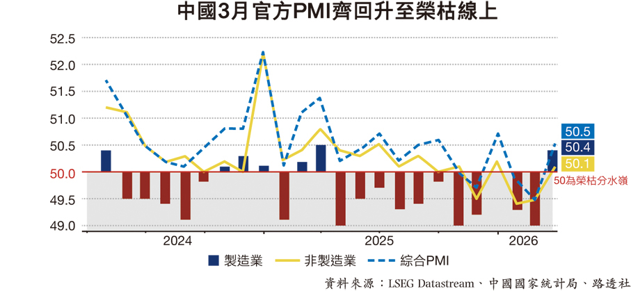 國家統計局昨公布數據顯示,3月份中國製造業採購經理指數(PMI)報50.4,較2月上升1.4,是今年以來首度企穩50以上的擴張區間,並升至1年高位。與此同時,非製造業商務活動指數及綜合PMI產出指數亦重返擴張區間,分別錄得50.1%及50.5%,較上月分別上升0.6及1.0個百分點,三大指數同步回升,反映內地經濟景氣水平明顯好轉。 ●香港文匯報記者 蔡競文