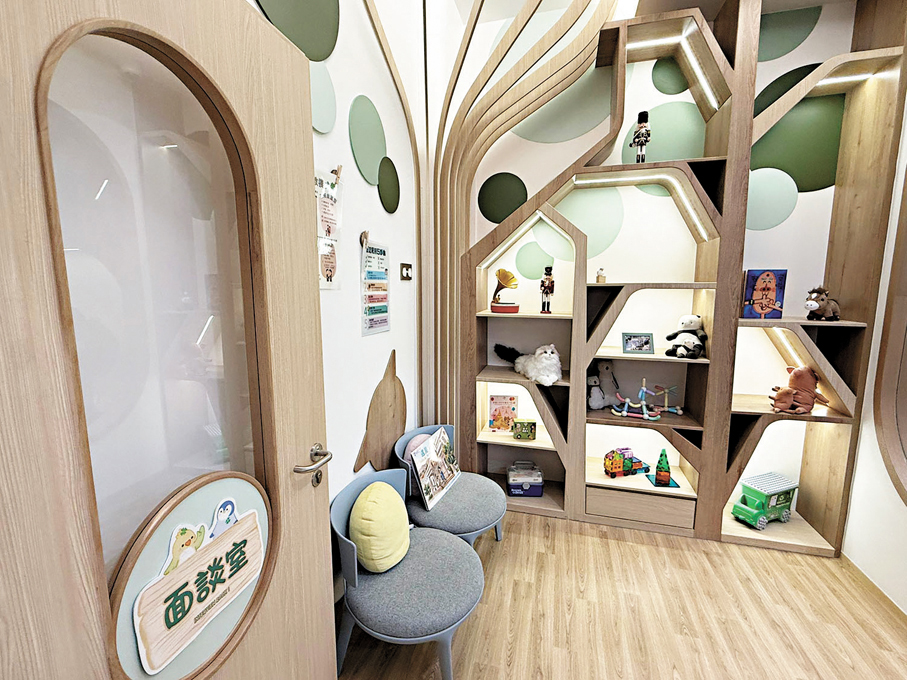 香港文匯報記者昨日受邀參觀「悅兒家」,先後參觀接見和安撫兒童情緒的面見室、運動空間以及兒童就餐和睡覺的空間等。現場隨處可見各種童趣的動物造型設計,亦有很多動物造型的可愛玩偶,令人放鬆心情。