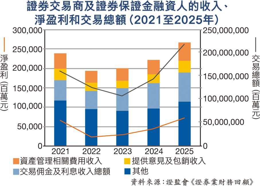 聯交所去年平均每日成交額突破新高至2,498億元,較2024年的1,318億元增加90%。恒生指數於2025年12月31日收報25,631點,較2024年底的收市水平高28%。市場暢旺亦惠及證券經紀行業,證監會報告顯示,去年香港證券經紀行的淨盈利急升62%,錄得717億元,創5年新高。證券業的交易總額按年攀升52%至219萬億元,打破2021年創下的前高位。期內,來自證券交易、期貨和期權交易、槓桿式外匯交易及虛擬資產交易的淨佣金收入,以及利息收入總額按年升16%至755億元。當中證券交易的淨佣金收入急升50%至302億元,與交易總額的增幅一致,是券商收入大漲的主要動力。