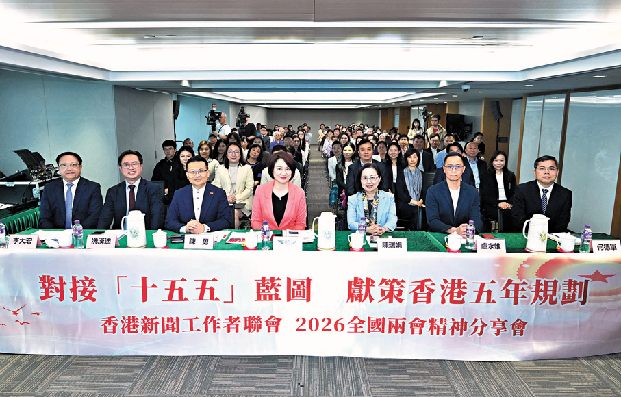 香港文匯報訊(大公文匯全媒體記者 義昊、楊嘯川)香港新聞工作者聯會昨日舉辦「對接『十五五』藍圖 獻策香港五年規劃」2026全國兩會精神分享會。全國人大常委會委員李慧琼,全國政協常委唐英年,港區全國人大代表陳勇、冼漢廸,全國政協委員陳瑞娟、盧永雄等,與香港新聞界同仁深入研習全國兩會重要精神,聚焦國家「十五五」規劃開局之年香港的發展機遇與角色擔當,為香港首份五年規劃編制建言獻策。中央政府駐港聯絡辦宣文部二級巡視員何德軍應邀出席。