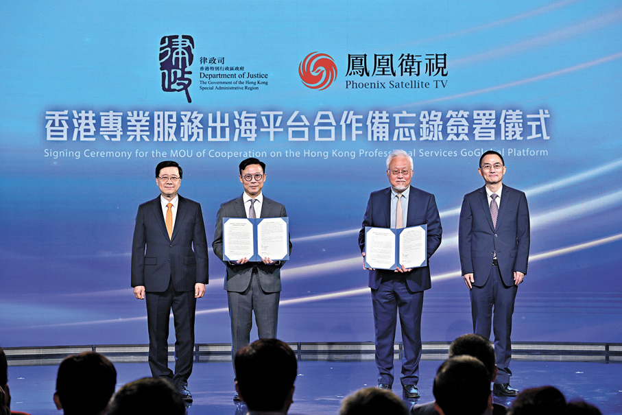 鳳凰衛視昨日於其香港總部舉行鳳凰衛視成立30周年台慶盛典,香港特區律政司副司長張國鈞與鳳凰衛視執行副總裁兼集團財務總監楊家強簽署了《香港專業服務出海平台合作備忘錄》,加強香港專業服務支援內企出海工作。香港特區行政長官李家超在典禮上致辭時表示,香港特區政府會積極對接國家「十五五」規劃,團結香港各界全力融入和服務國家發展大局,會發揮香港「超級聯繫人」和「超級增值人」的角色,積極弘揚優秀中華文化,服務國家高水平對外開放。 ●香港文匯報記者 盧慧穎