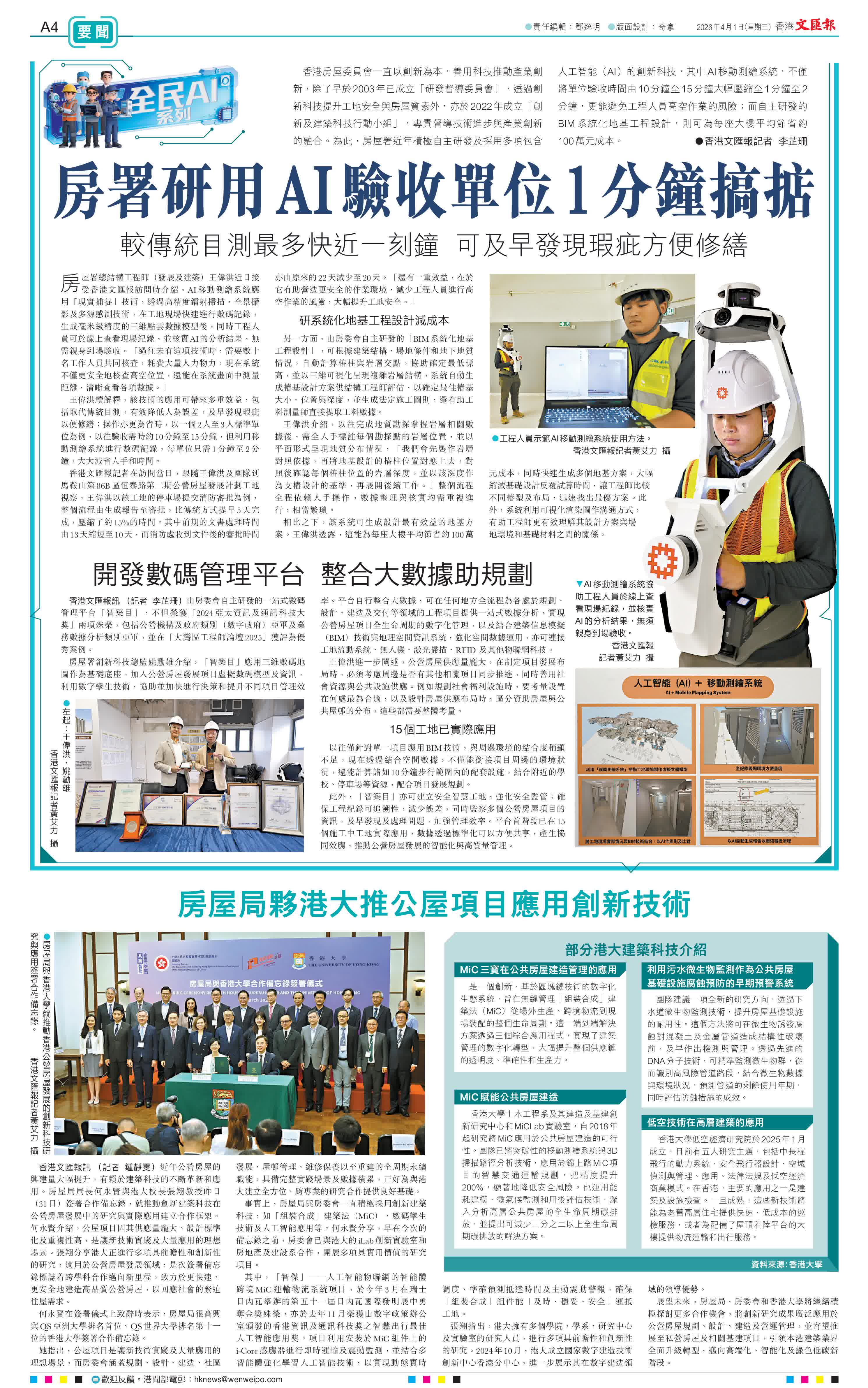 (香港文匯報記者 李芷珊)香港房屋委員會一直以創新為本,善用科技推動產業創新,除了早於2003年已成立「研發督導委員會」,透過創新科技提升工地安全與房屋質素外,亦於2022年成立「創新及建築科技行動小組」,專責督導技術進步與產業創新的融合。為此,房屋署近年積極自主研發及採用多項包含人工智能(AI)的創新科技,其中AI移動測繪系統,不僅將單位驗收時間由10分鐘至15分鐘大幅壓縮至1分鐘至2分鐘,更能避免工程人員高空作業的風險;而自主研發的BIM系統化地基工程設計,則可為每座大樓平均節省約100萬元成本。