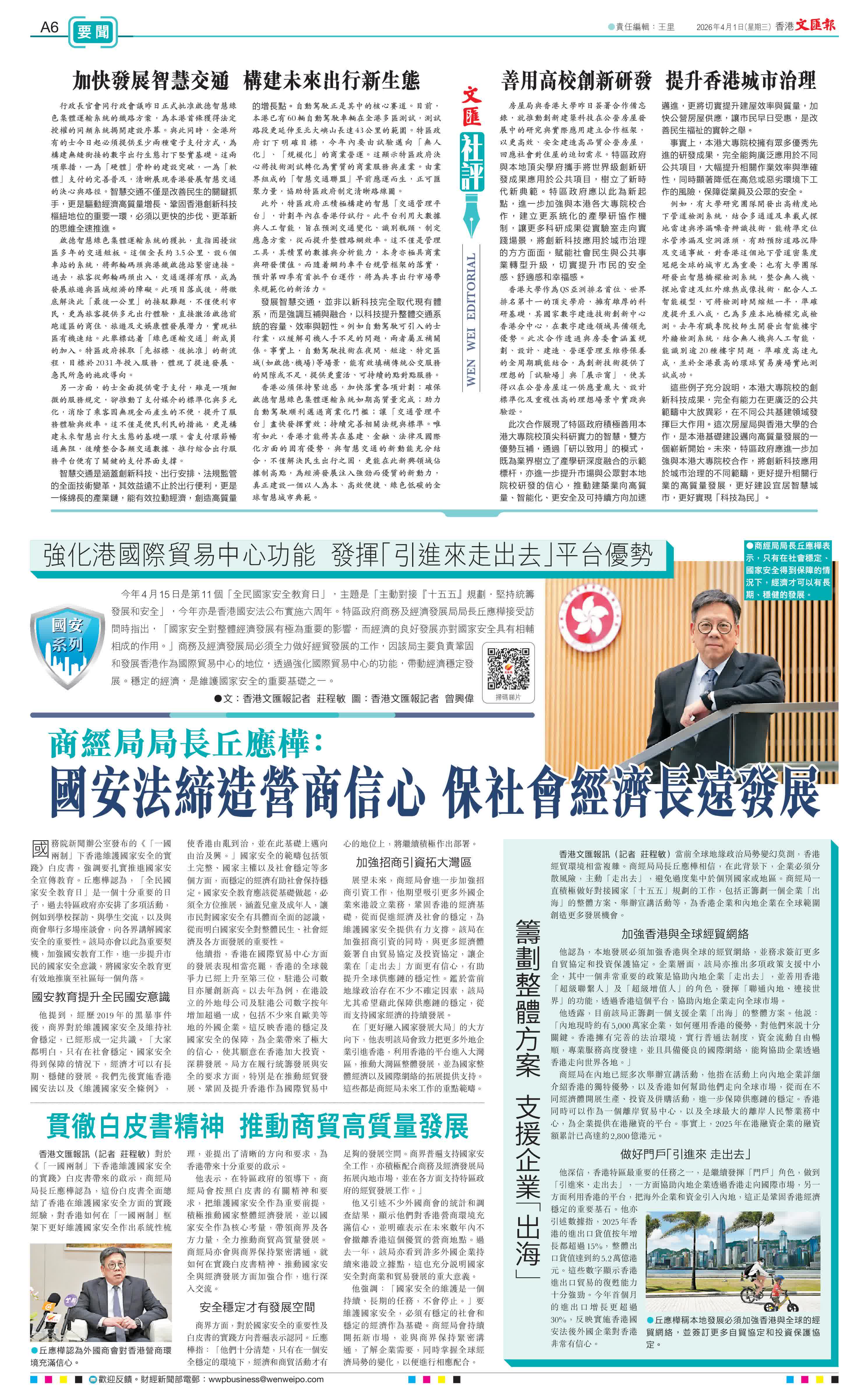 香港文匯報訊(記者 莊程敏)今年4月15日是第11個「全民國家安全教育日」,主題是「主動對接『十五五』規劃·堅持統籌發展和安全」,今年亦是香港國安法公布實施六周年。特區政府商務及經濟發展局局長丘應樺接受訪問時指出,「國家安全對整體經濟發展有極為重要的影響,而經濟的良好發展亦對國家安全具有相輔相成的作用。」商務及經濟發展局必須全力做好經貿發展的工作,因該局主要負責鞏固和發展香港作為國際貿易中心的地位,透過強化國際貿易中心的功能,帶動經濟穩定發展。穩定的經濟,是維護國家安全的重要基礎之一。
