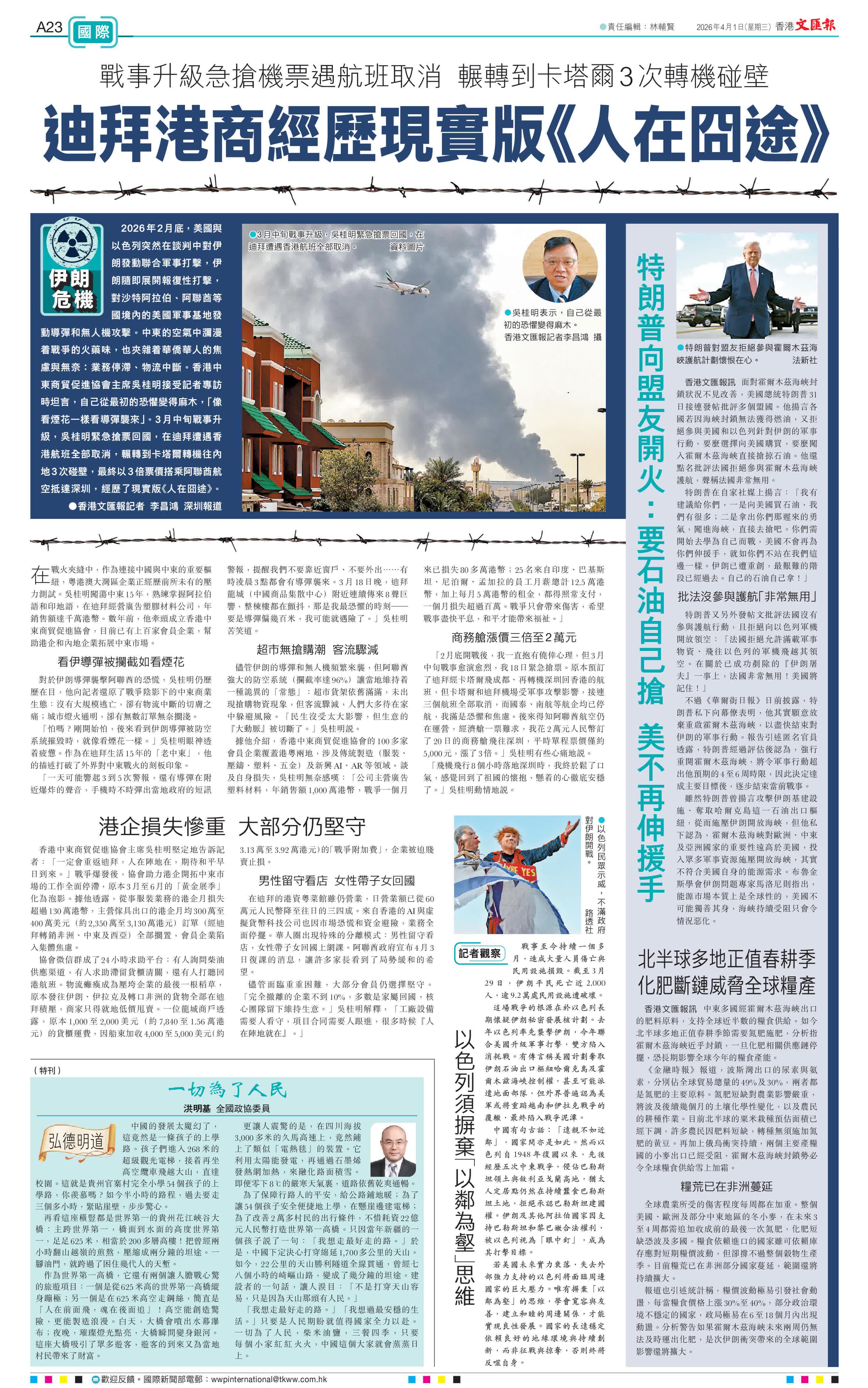香港文匯報訊(記者 李昌鴻)2026年2月底,美國與以色列突然在談判中對伊朗發動聯合軍事打擊,伊朗隨即展開報復性打擊,對沙特阿拉伯、阿聯酋等國境內的美國軍事基地發動導彈和無人機攻擊。中東的空氣中瀰漫着戰爭的火藥味,也夾雜着華僑華人的焦慮與無奈:業務停滯、物流中斷。香港中東商貿促進協會主席吳桂明接受記者專訪時坦言,自己從最初的恐懼變得麻木,「像看煙花一樣看導彈襲來」。3月中旬戰事升級,吳桂明緊急搶票回國,在迪拜遭遇香港航班全部取消,輾轉到卡塔爾轉機往內地3次碰壁,最終以3倍票價搭乘阿聯酋航空抵達深圳,經歷了現實版《人在囧途》。