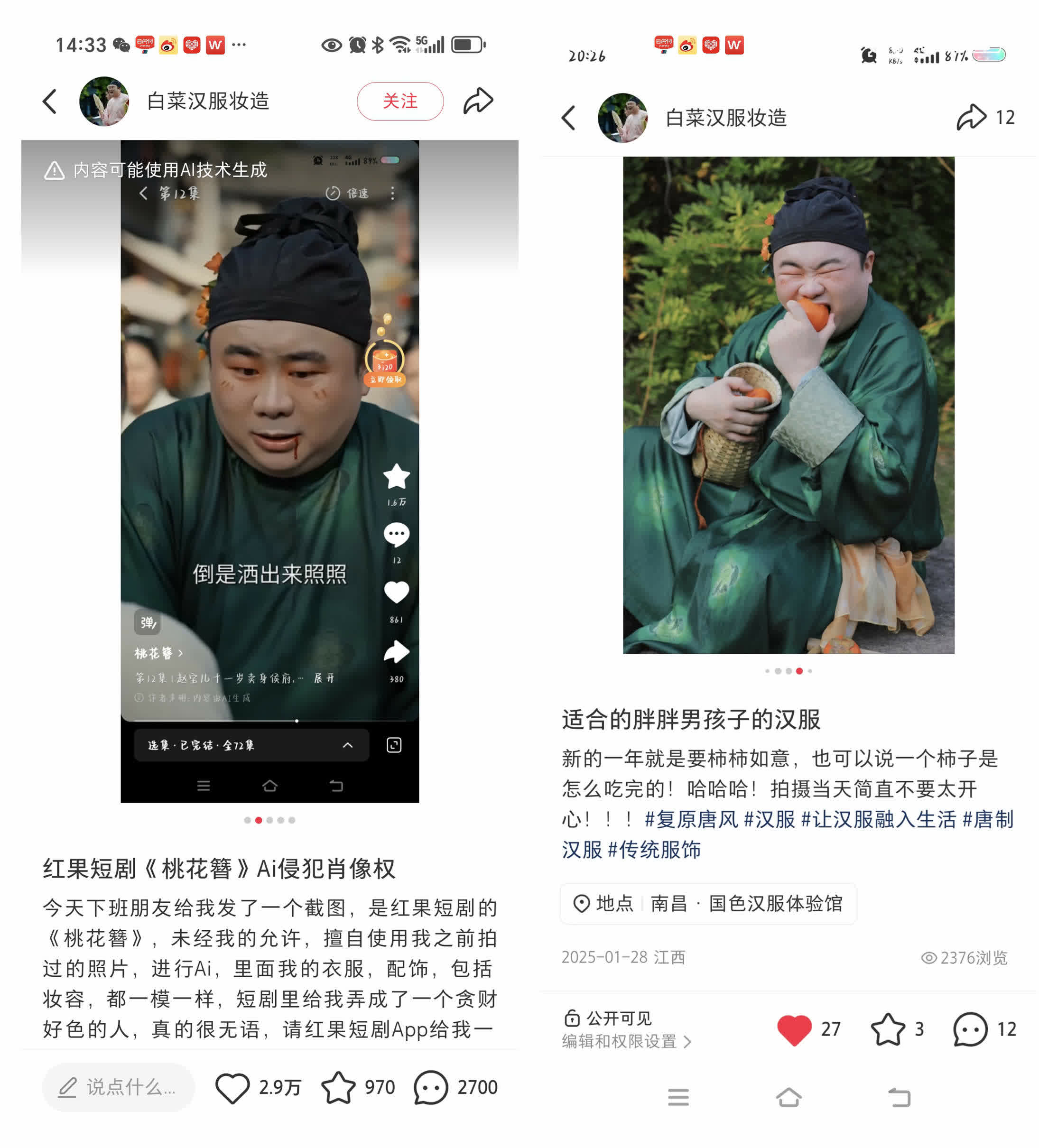 最近,有博主發現,自己在網上發的個人照片,被直接拿去AI生成短劇裏的配角了。從圖片中可以看出,短劇中的配角與博主此前拍攝的寫真照片從人物形象到服飾、妝造都高度相似。
