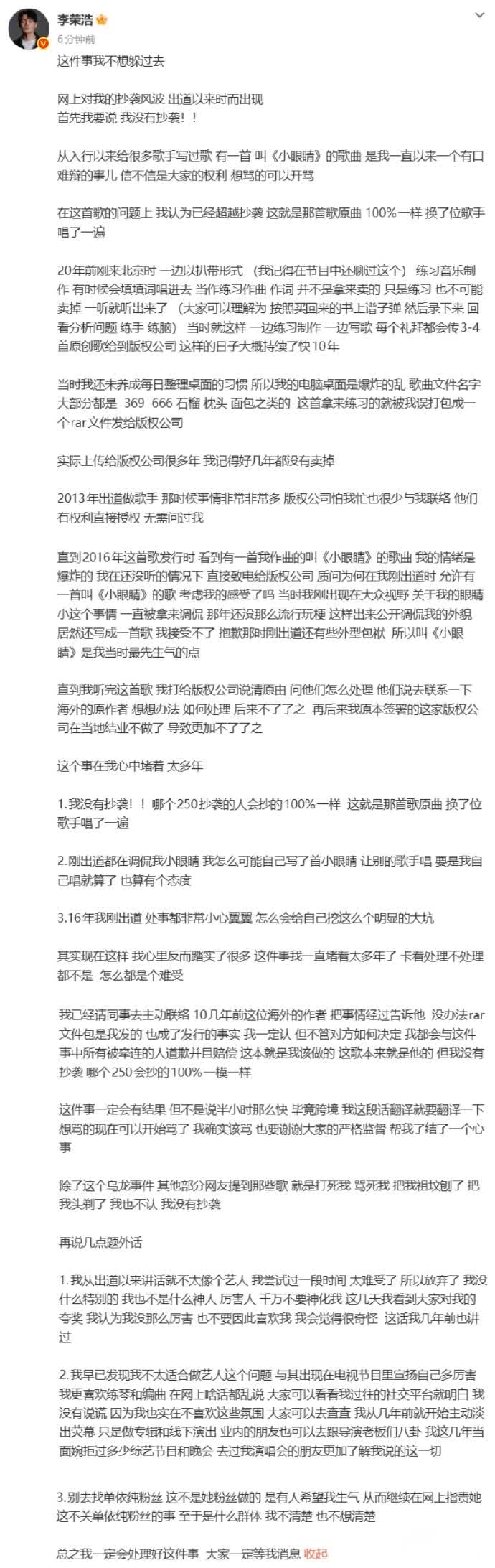 李榮浩今日在社交平台上發布長文,對《小眼睛》抄襲爭議作出回應,強調該曲實為早年練習扒帶填詞的「誤發」產物,並否認其他所有抄襲指控。