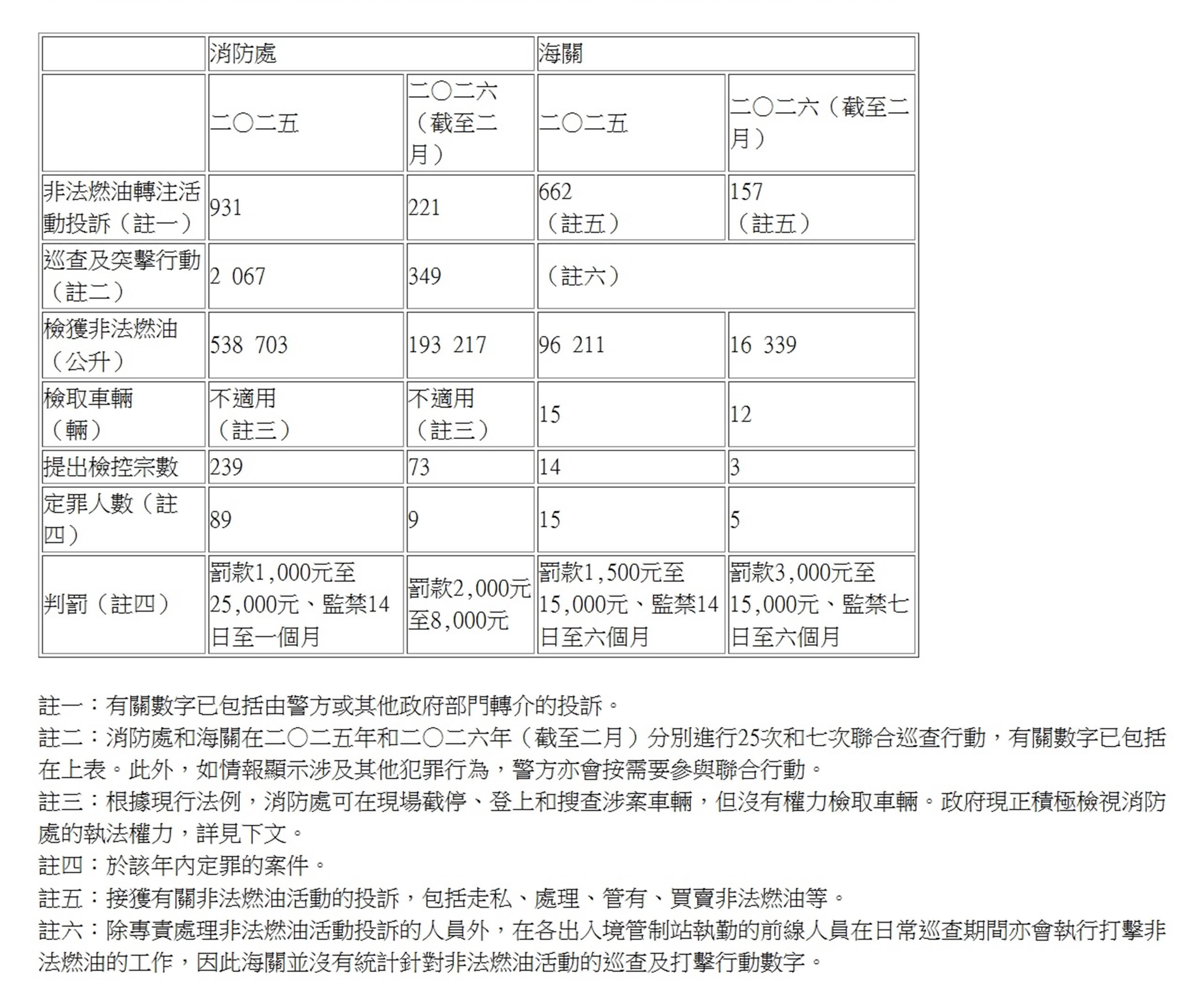 2026年至今,海關聯同消防處和警務處的聯合行動共偵破12宗涉及非法燃油的案件,當中包括於1月5日至18日期間與消防處展開代號「擊破」的全港性打擊非法燃油活動聯合行動,以及消防處聯同海關和警務處於2月13日進行的代號「截流」打擊非法燃油轉注活動聯合行動。