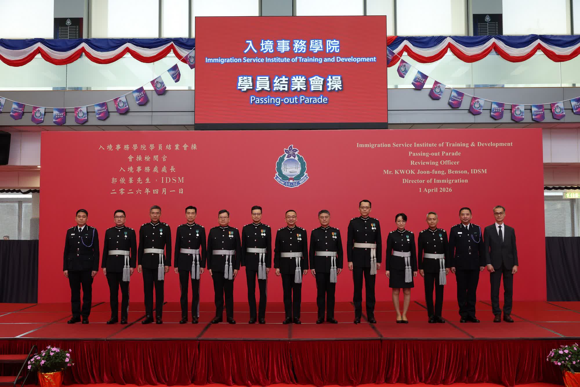 香港文匯報訊(記者 蕭景源)入境事務處(入境處)處長郭俊峯今日(4月1日)主持入境事務學院學員結業會操,檢閱最新130名結業學員,包括41名入境事務主任及89名入境事務助理員。郭俊峯表示,2026年是入境處自1961年成立以來65周年重要里程碑,入境處始終與香港社會同心同行,上下一心守護香港、服務市民。隨着部門總部遷入將軍澳,各分部正同心協力提升效能,積極擁抱科技和善用人工智能邁向「智慧入境處」時代,同時堅守「以人為本」的服務初心。