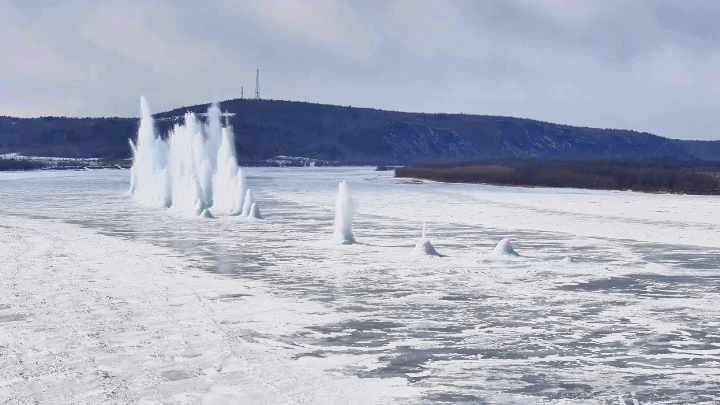 專業爆破隊伍先用鑽孔機精準打穿厚達1.5米的冰層,將炸藥精準布設至冰面下緊貼冰層的位置,隨後完成引線連接、人員撤離等流程。起爆指令落下,江面冰層轟然碎裂,數十米冰霧騰空而起,壯闊場面震撼人心。