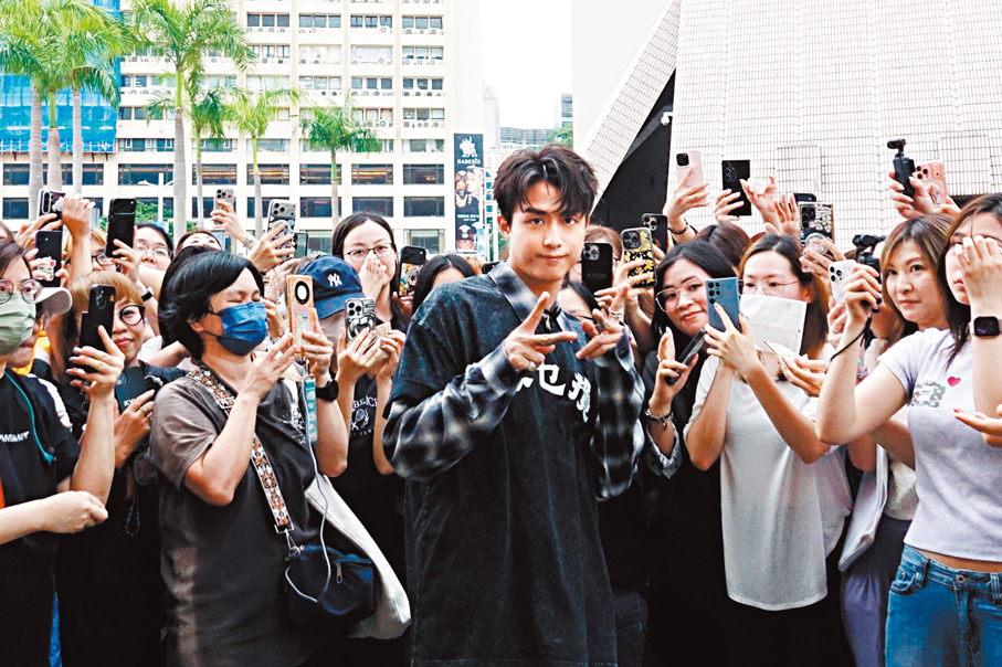 香港文匯報訊(記者 子棠)江𤒹生(Anson Kong)@MIRROR 前日驚喜現身尖沙咀鐘樓,為新歌《攬緊處理》進行快閃宣傳活動,向途人大派飛機欖,雖然派發時間僅15分鐘,吸引大批「生粉」(粉絲暱稱)到場支持之餘,還引來大量途人圍觀,氣氛熾熱。