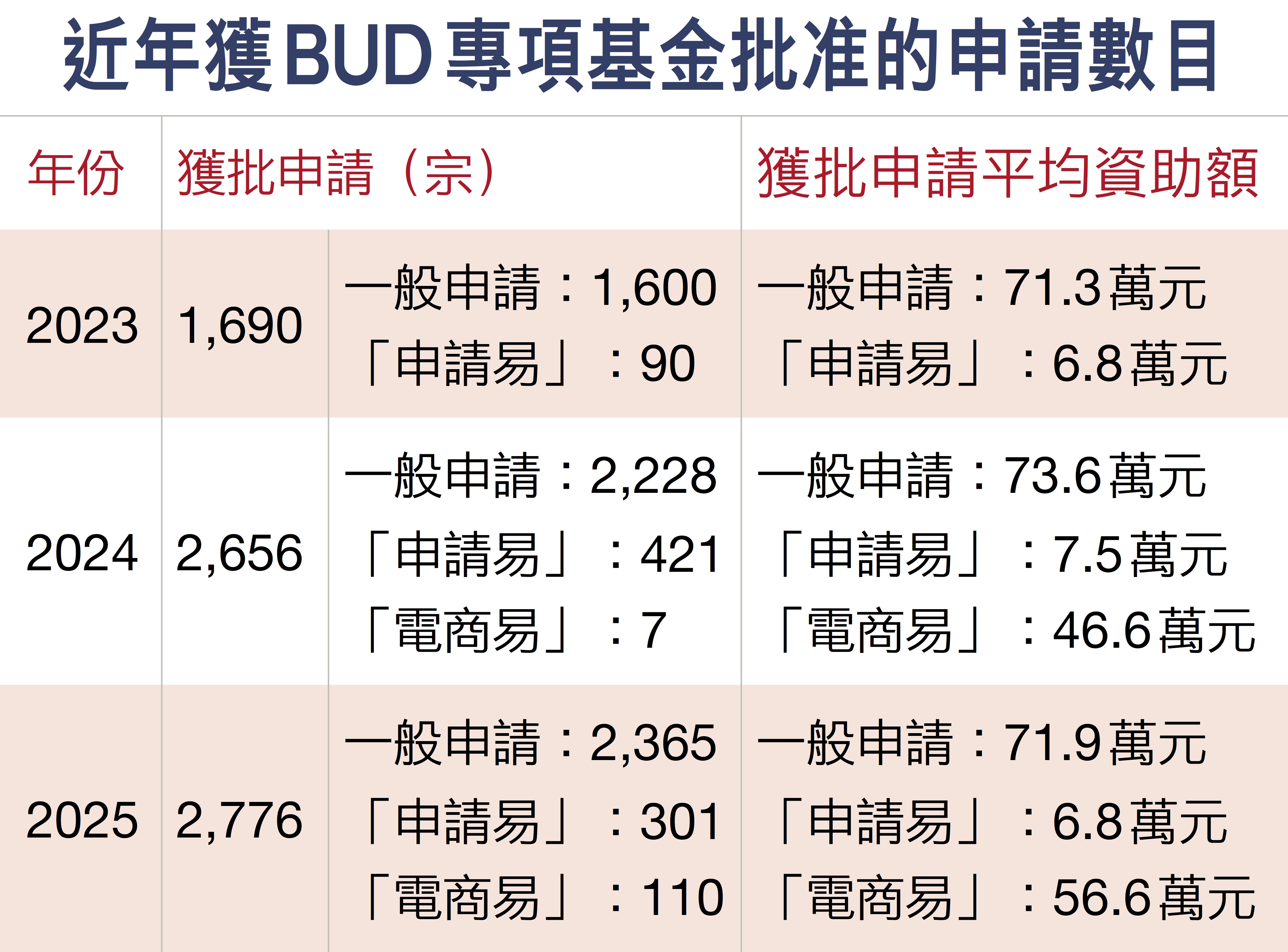 BUD專項基金自2012年推出以來,申請數字持續增長,2024年接獲7,262宗申請,創下歷年高峰;2025年雖回落至5,347宗,但仍較2019年水平激增逾兩倍,反映本地企業正加速開拓新市場與數碼轉型。其中,「電商易」於2024年7月推出後反應熱烈,首半年接獲227宗申請,2025年全年更錄得521宗,顯示企業對拓展網上銷售渠道的需求顯著上升。