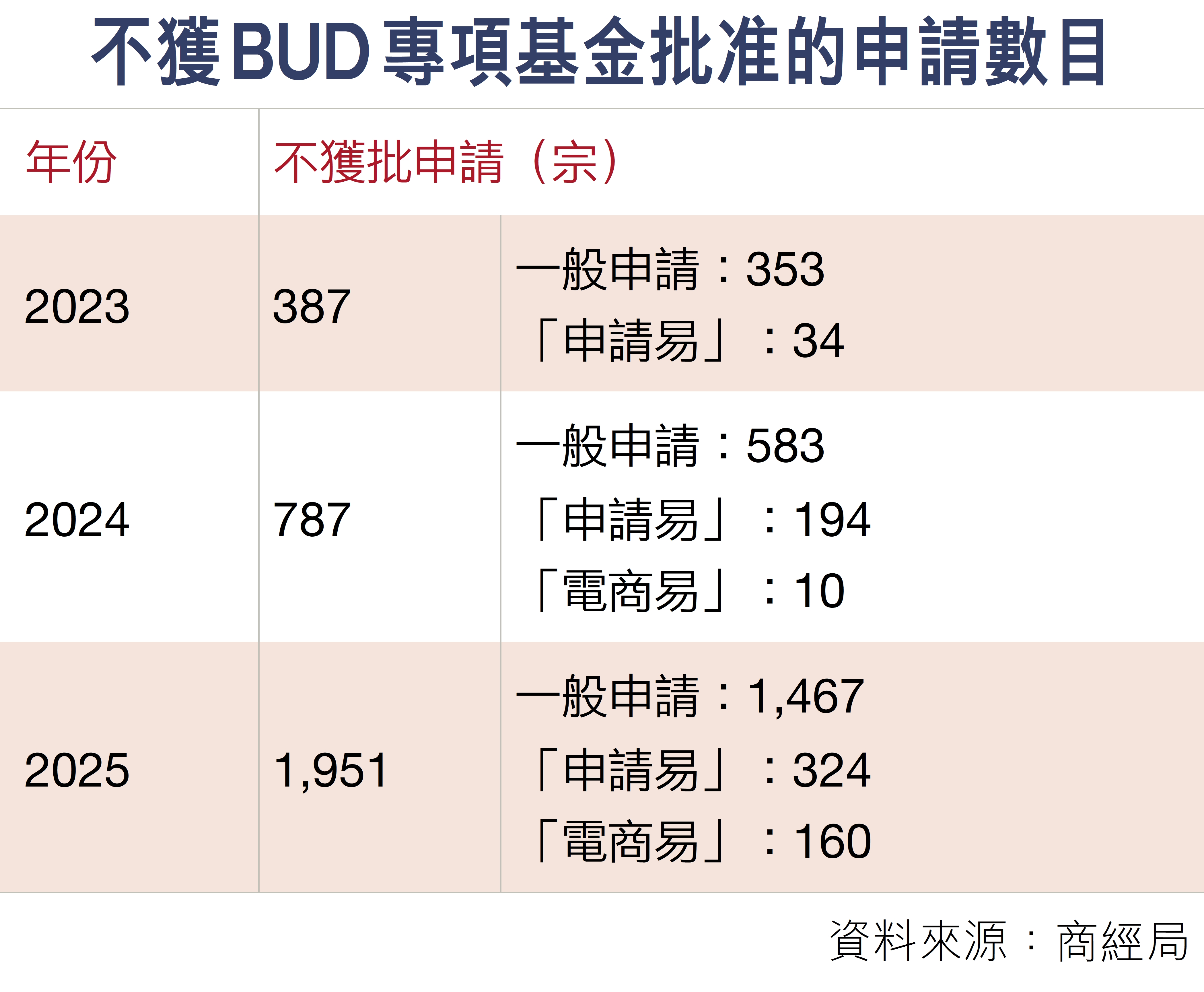 香港文匯報訊(記者 馬翠媚)特區政府資助中小企升級轉型的「發展品牌、升級轉型及拓展內銷市場的專項基金」(BUD專項基金),近年申請宗數屢創新高,惟不同申請類別的獲批率差異明顯。商經局局長丘應樺昨書面回覆立法會議員時披露,截至去年底,主打簡化審批的「申請易」獲批率為60%,而針對電子商貿的「電商易」獲批率僅41%,反映企業在申請過程中面臨一定門檻。不過他透露,政府擬於今季推出新一輪優化措施,包括擴大資助地域範圍及提升「申請易」資助上限,並加強對企業的申請支援。