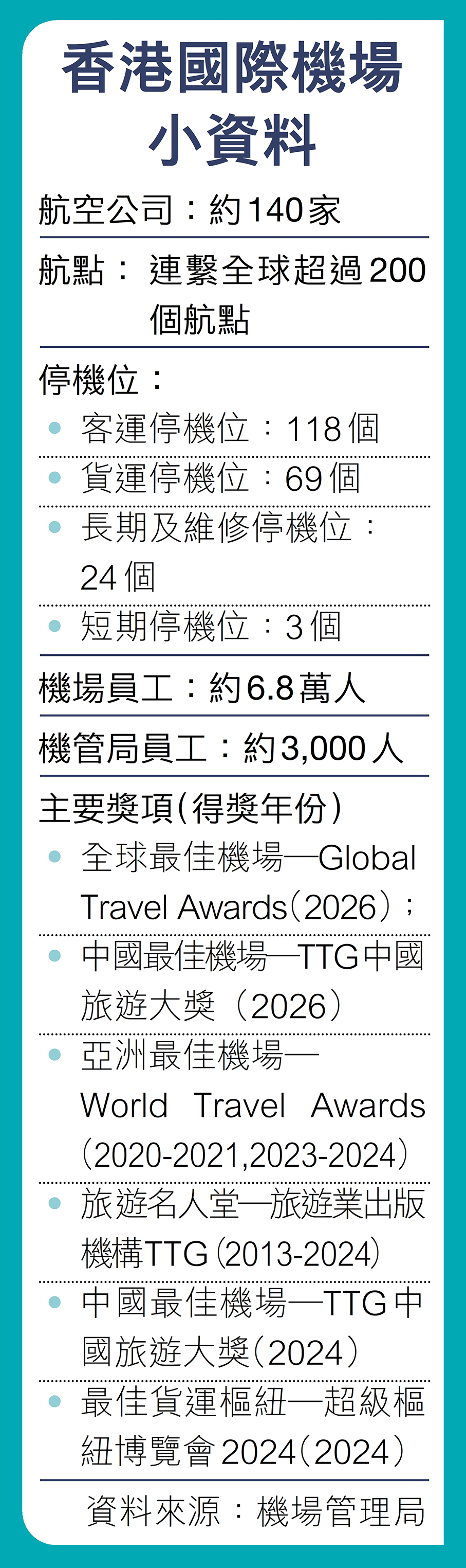 對於全球各地訪港的旅客而言,香港國際機場往往是他們抵埗所見的第一抹風景,對建立香港的「第一印象」至關重要。香港國際機場三喜臨門,憑藉安檢流程、航空基建、旅客服務,以及持續優化的旅客設施等卓越表現,榮獲多項備受推崇的國際獎項,包括在Global Travel Awards 2026中,贏得「全球最佳機場」殊榮;在2026年「TTG中國旅遊大獎」中,連續第三年獲選為「中國最佳機場」;亦在Skytrax 2026「全球機場大獎」中躋身全球第四,比去年上升兩名。有機管局董事昨日接受香港文匯報訪問時指,香港國際機場有優越的地理位置和完善配套,加上一直積極運用高新科技,致力為旅客帶來更良好體驗,隨着機場二號客運大樓、機場城市「SKYTOPIA」等相繼啟用和發展,定可持續為機場注入新元素,提升旅客來港的第一體驗。 ●香港文匯報記者 張弦