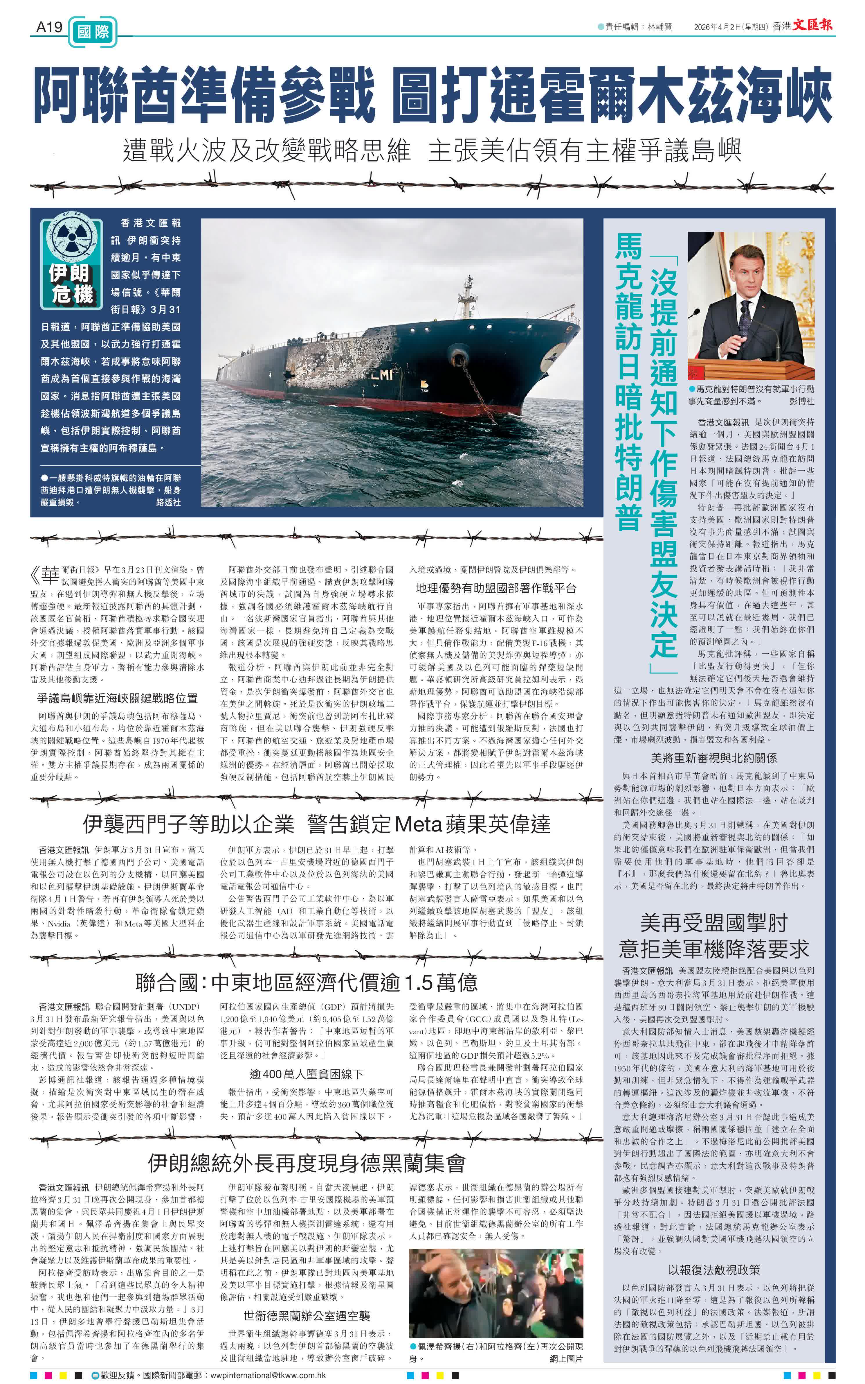 香港文匯報訊 伊朗衝突持續逾月,有中東國家似乎傳達下場信號。《華爾街日報》3月31日報道,阿聯酋正準備協助美國及其他盟國,以武力強行打通霍爾木茲海峽,若成事將意味阿聯酋成為首個直接參與作戰的海灣國家。消息指阿聯酋還主張美國趁機佔領波斯灣航道多個爭議島嶼,包括伊朗實際控制、阿聯酋宣稱擁有主權的阿布穆薩島。