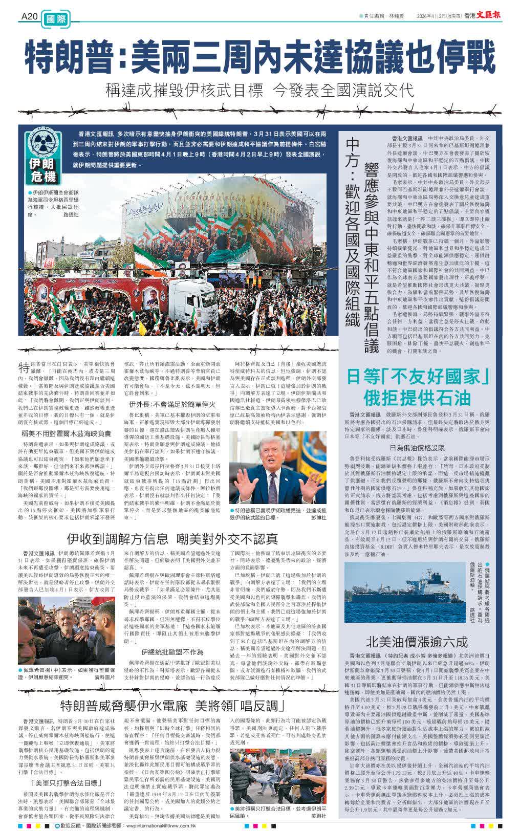 伊朗總統佩澤希齊揚3月31日表示,如果獲得堅實保證,確保伊朗未來不再遭受攻擊,伊朗願意結束衝突。要讓美以侵略伊朗導致的局勢恢復正常的唯一解決辦法,就是侵略者停止攻擊。伊朗外交部發言人巴加埃4月1日表示,伊方收到了來自調解方的信息,稱美國希望通過外交途徑解決問題,但經驗表明「美國對外交並不認真」。