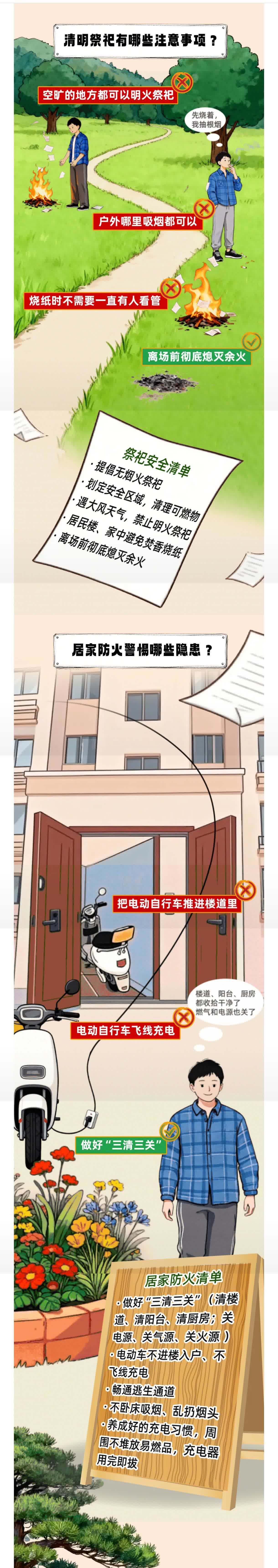 提倡無煙火祭祀;劃定安全區域,清理可燃物;遇大風天氣,禁止明火祭祀;居民樓、家中避免焚香燒紙;離場前徹底熄滅餘火。