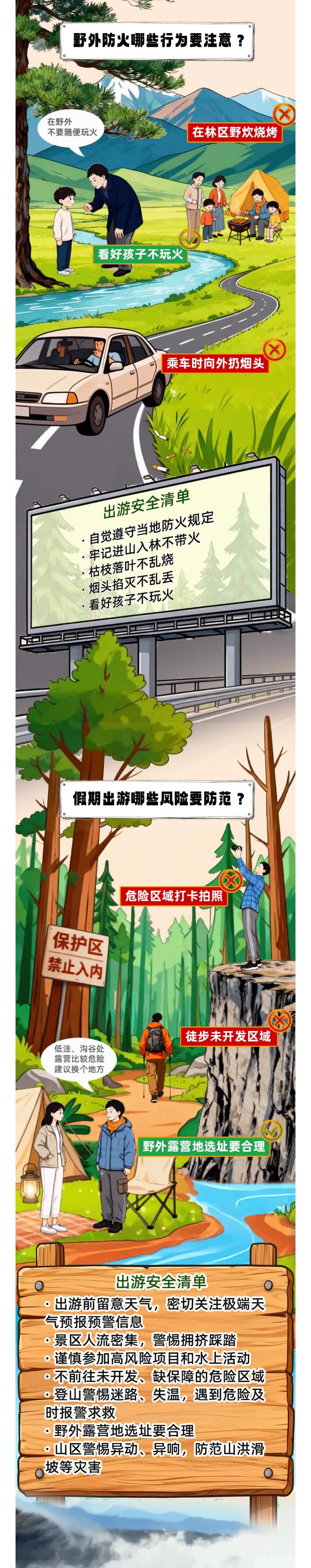 出遊前留意天氣,密切關注極端天氣預報預警信息;景區人流密集,警惕擁擠踩踏;謹慎參加高風險項目和水上活動;不前往未開發、缺保障的危險區域;登山警惕迷路、失溫,遇到危險及時報警求救;野外露營地選址要合理;山區警惕異動、異響,防範山洪滑坡等災害。