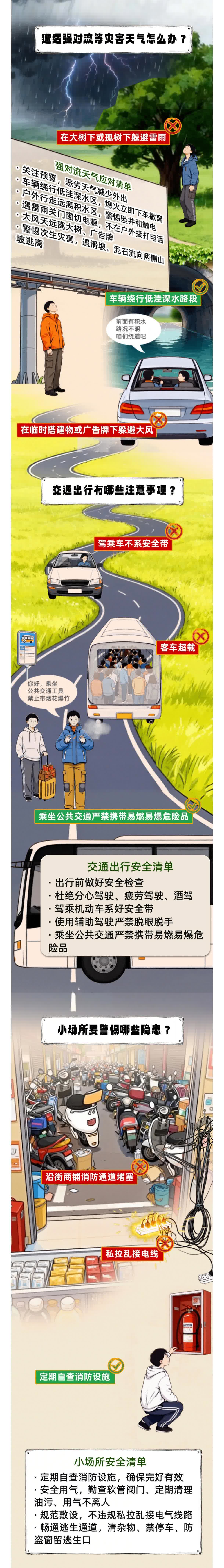 關注預警,惡劣天氣減少外出;車輛繞行低窪深水區,熄火立即下車撤離;戶外行走遠離積水區,警惕墜井和觸電;遇雷雨關門窗切電源,不在戶外接打電話;大風天遠離大樹、廣告牌;警惕次生災害,遇滑坡、泥石流向兩側山坡逃離。