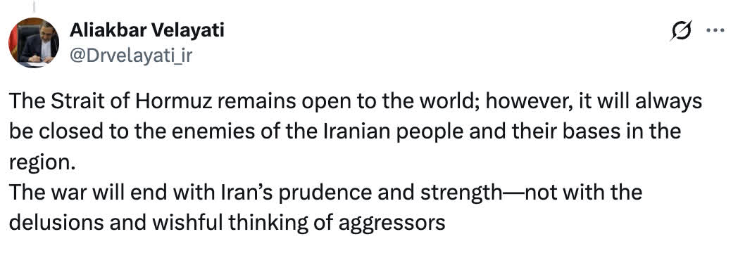 據央視新聞報道,當地時間4月2日,伊朗最高領袖外事顧問、前外長韋拉亞提在其個人社交媒體平台賬號上表示,霍爾木茲海峽對世界開放,但對伊朗人民的敵人及其在該地區的據點將永遠關閉。